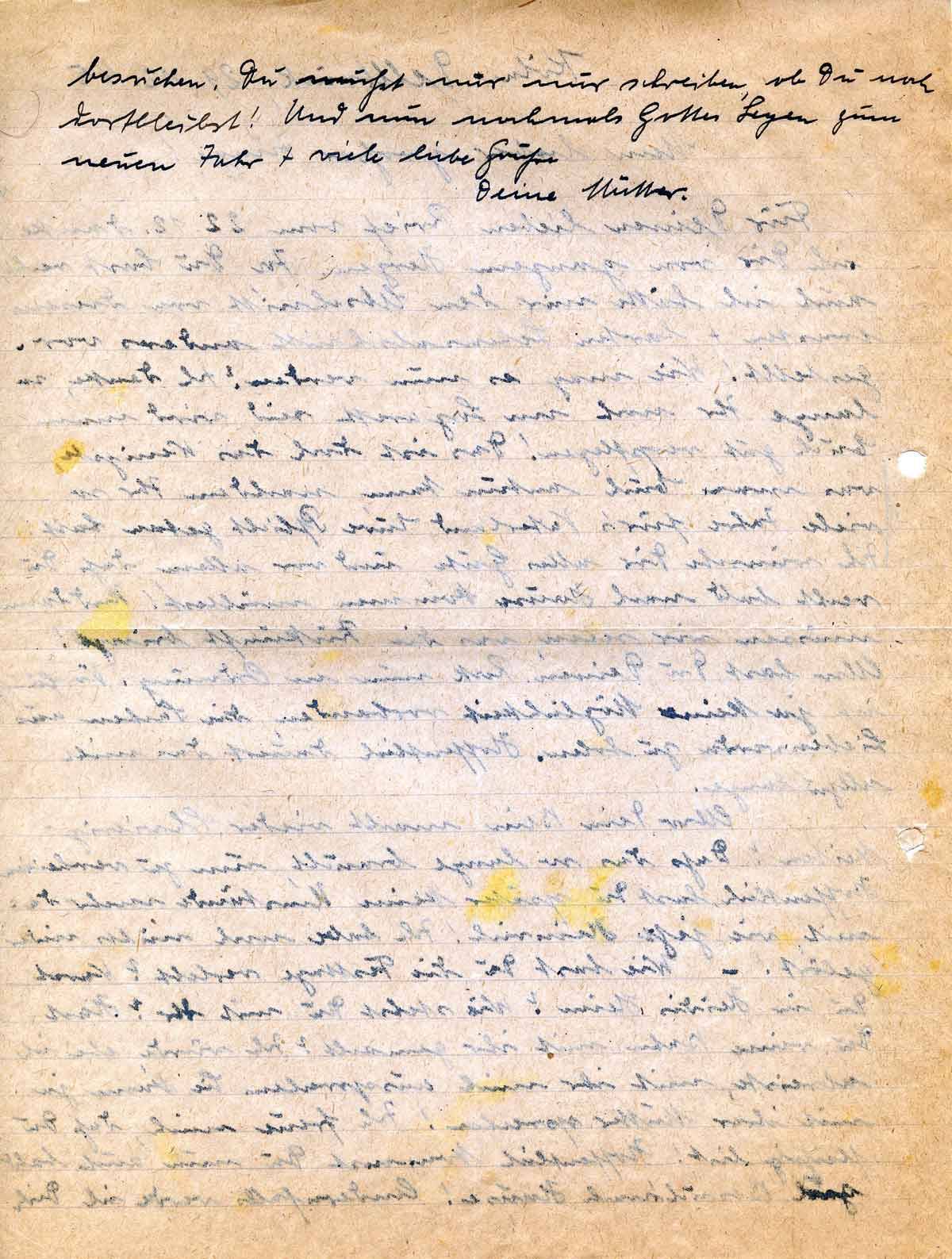 Für Deinen lieben Brief vom 22.12. danke ich Dir von ganzem Herzen. Ja, Du hast recht, auch ich hätte mir den Abschnitt von diesem ernsten + harten Lebensabschnitt anders vorgestellt! Wie mag es nun werden? Ich denke, so lange Ihr noch im Lazarett seid, wird man Euch gut verpflegen! Das ist doch das Wenigste, was man Euch antun kann, nachdem Ihr so viele Jahre für’s Vaterland Eure Pflicht getan habt! Ich wünsche Dir alles Gute, und vor allem, daß Du recht bald nach Hause kommen möchtest! Und dann müssen wir sehen, was die Zukunft bringt! Also hast Du Deinen Rock nun in Ordnung. Vorläufig ist ja keine Möglichkeit vorhanden, die Sachen aus Liebenwerda zu holen. Hoffentlich dauert das nicht allzu lange.