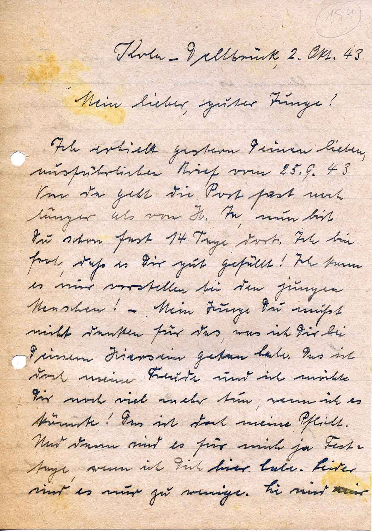 Ich erhielt gestern Deinen lieben, ausführlichen Brief vom 25.9.43 Von da geht die Post fast noch länger als von H. Ja, nun bist Du schon fast 14 Tage dort. Ich bin froh, daß es Dir gut gefällt! Ich kann es mir vorstellen bei den jungen Menschen! – Mein Junge Du mußt nicht danken für das, was ich Dir bei Deinem Hiersein getan habe. Das ist doch meine Freude und ich möchte Dir noch viel mehr tun, wenn ich es könnte! Das ist doch meine Pflicht. Und dann sind es für mich ja Festtage, wenn ich Dich hier habe. Leider sind es nur zu wenige. Sie sind mir