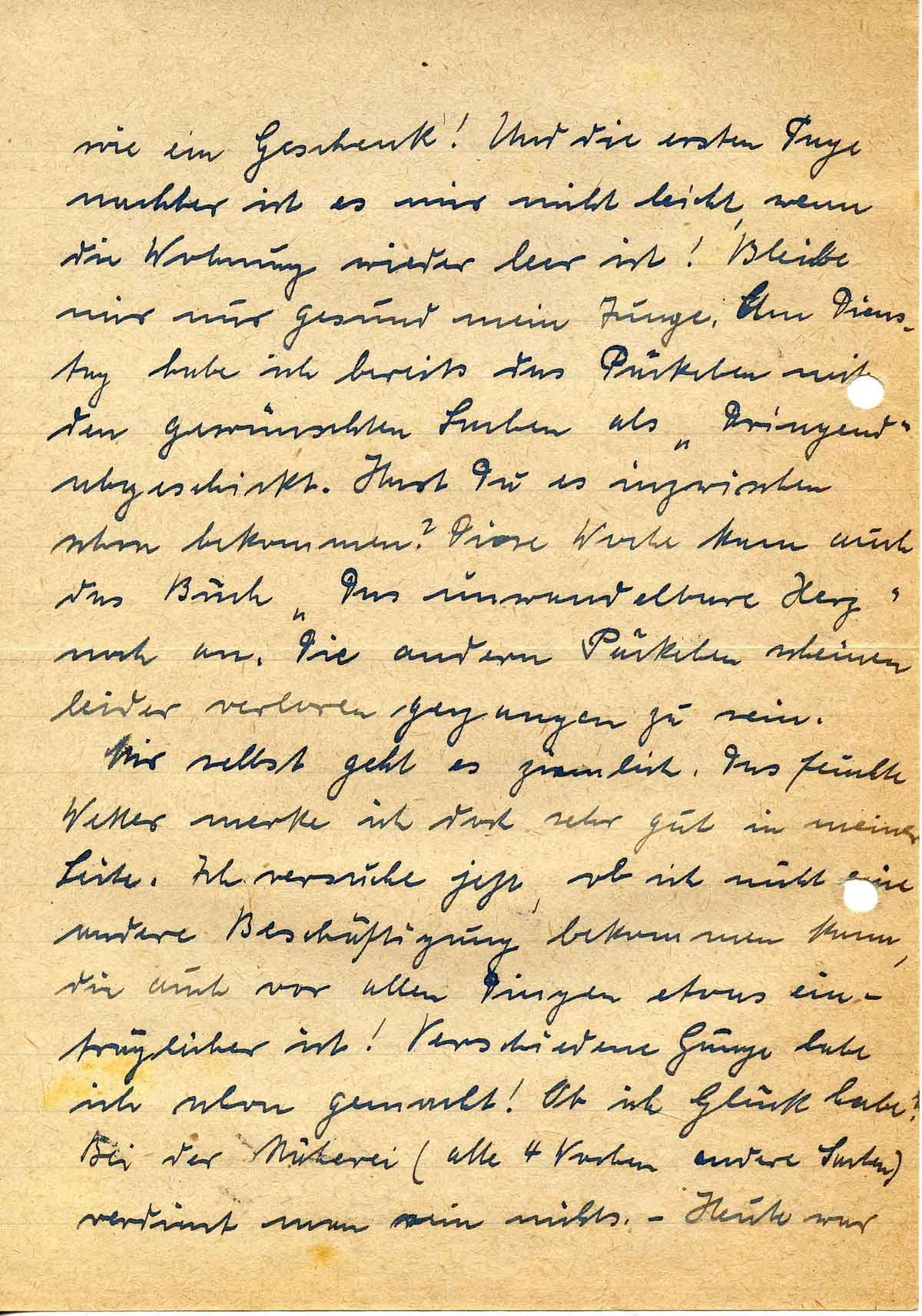 wie ein Geschenk! Und die ersten Tage nachher ist es mir nicht leicht, wenn die Wohnung wieder leer ist! Bleibe mir nur gesund mein Junge. Am Dienstag habe ich bereits das Päckchen mit den gewünschten Sachen als „Dringend“ abgeschickt. Hast Du es inzwischen schon bekommen? Diese Woche kam auch das Buch „Das unwandelbare Herz“ noch an. Die andern Päckchen scheinen leider verloren gegangen zu sein.