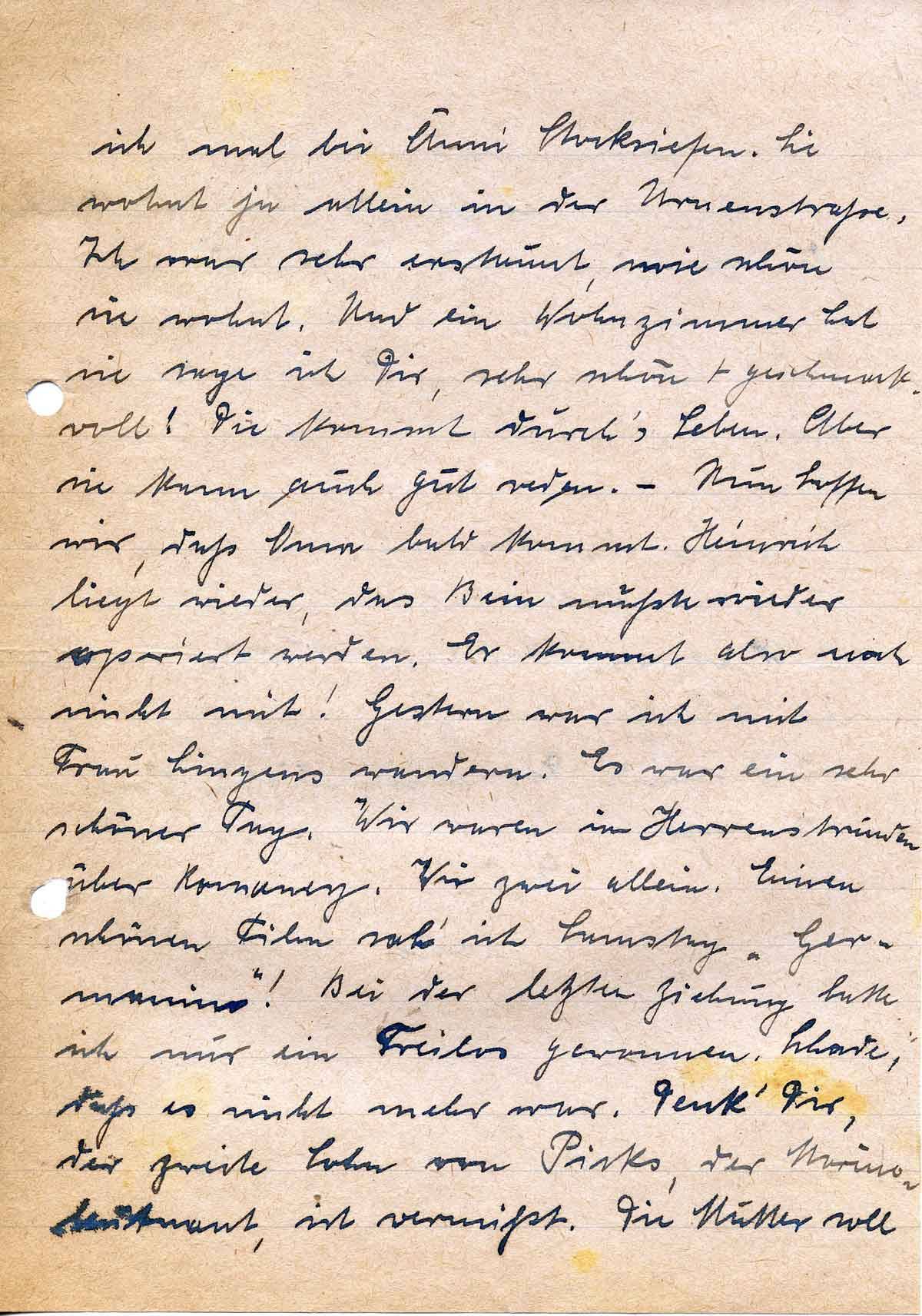 ich mal bei Anni Stocksiefen. Sie wohnt ja allein in der Urnenstraße. Ich war sehr erstaunt, wie schön sie wohnt. Und ein Wohnzimmer hat sie sage ich Dir, sehr schön + geschmackvoll! Die kommt durch’s Leben. Aber sie kann auch gut reden. – Nun hoffen wir, daß Oma bald kommt. Heinrich liegt wieder, das Bein mußte wieder operiert werden. Er kommt also noch nicht mit! Gestern war ich mit Frau Lingens wandern. Es war ein sehr schöner Tag. Wir waren in Herrenstrunden über Romaney. Wir zwei allein. Einen schönen Film sah‘ ich Samstag „Germanin“! Bei der letzten Ziehung hatte ich nur ein Freilos gewonnen. Schade, daß es nicht mehr war. Denk‘ Dir, der zweite Sohn von Picks, der Marineleutnant, ist vermißt. Die Mutter soll