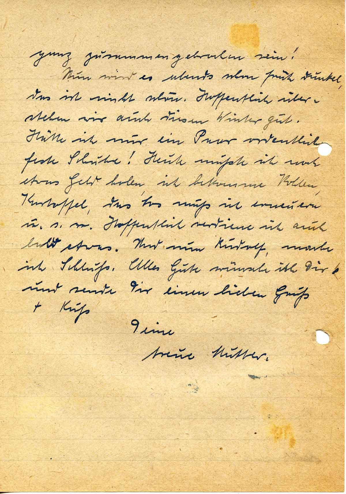 Nun wird es abends schon früh dunkel, das ist nicht schön. Hoffentlich überstehen wir auch diesen Winter gut. Hätte ich nur ein Paar ordentliche feste Schuhe! Heute mußte ich noch etwas Geld holen, ich bekomme Kohlen, Kartoffel, das Los muß ich erneuern u.s.w. Hoffentlich verdiene ich auch bald etwas. Und nun Rudolf, mache ich Schluß. Alles Gute wünsche ich Dir und sende Dir einen lieben Gruß + Kuß