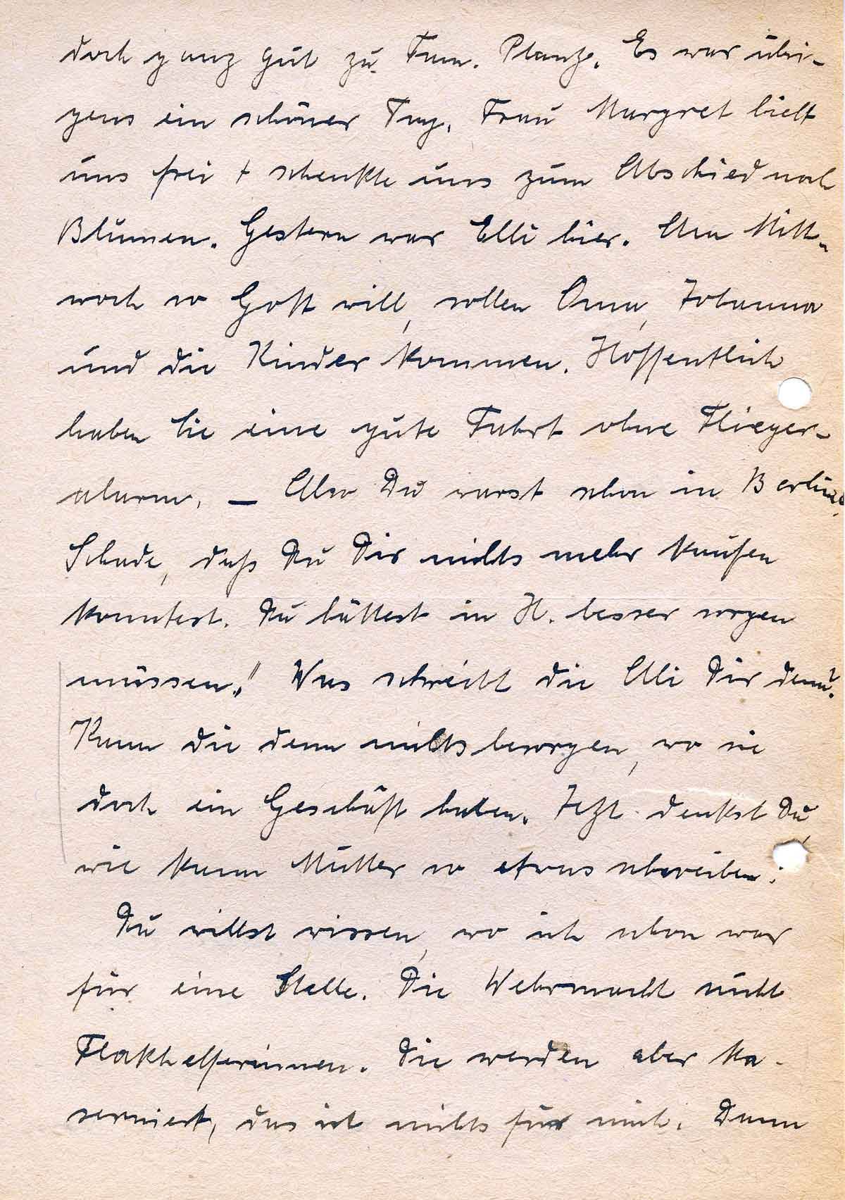 doch ganz gut zu Fam. Plantz. Es war übrigens ein schöner Tag. Frau Margret hielt uns frei + schenkte uns zum Abschied noch Blumen. Gestern war Elli hier. Am Mittwoch so Gott will, sollen Oma, Johanna und die Kinder kommen. Hoffentlich haben Sie eine gute Fahrt ohne Fliegeralarm. – Also Du warst schon in Berlin? Schade, daß Du Dir nichts mehr kaufen konntest. Du hättest in H. besser sorgen müssen! Was schreibt die Ali Dir denn? Kann die denn nichts besorgen, wo sie doch ein Geschäft haben. Jetzt denkst Du, wie kann Mutter so etwas schreiben!