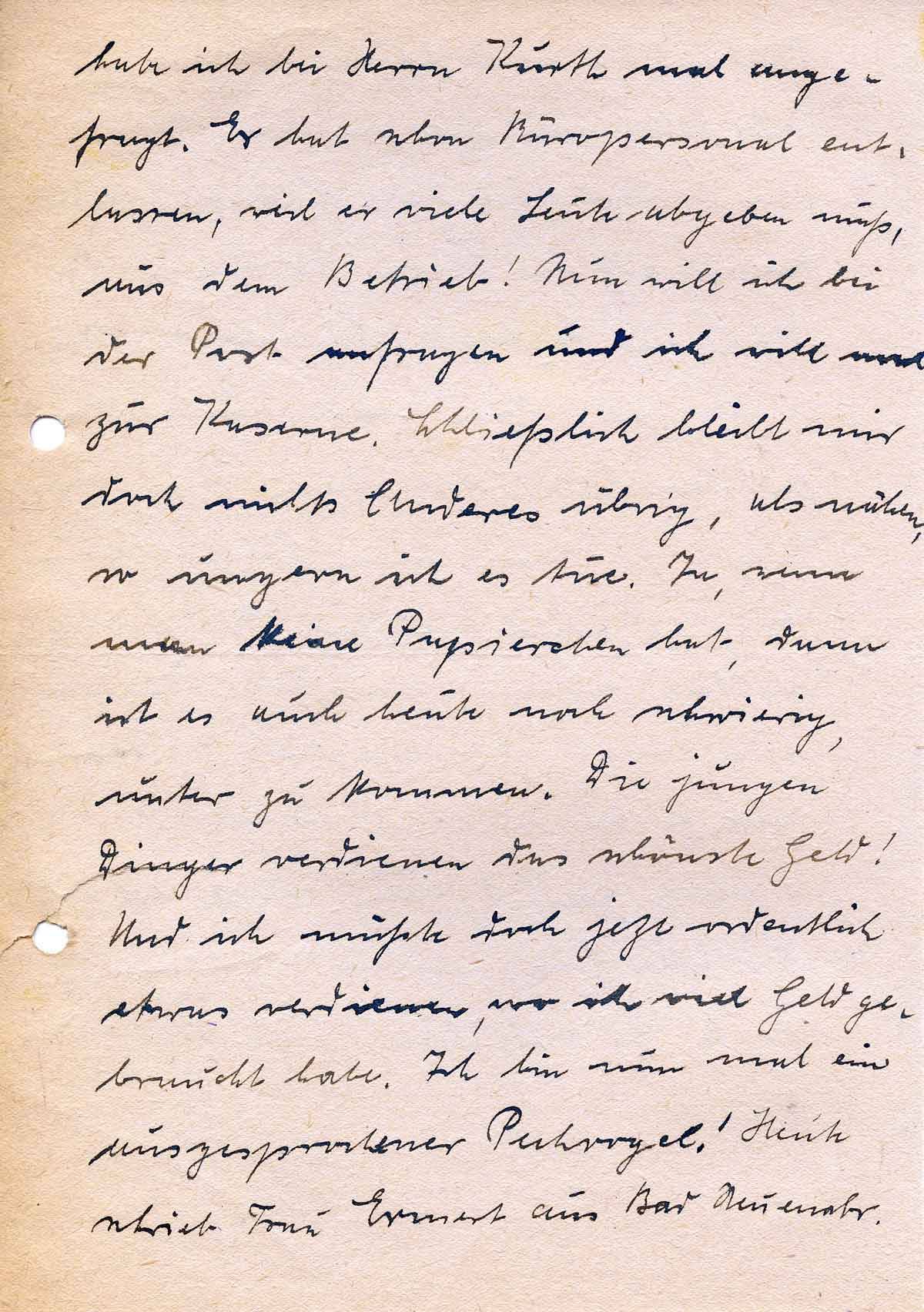 habe ich bei Herrn Kurth mal angefragt. Er hat schon Büropersonal entlassen, weil er viele Leute abgeben muß, aus dem Betrieb! Nun will ich bei der Post anfragen und ich will noch zur Kaserne. Schließlich bleibt mir doch nichts Anderes übrig, als nähen, so ungern ich es tue. Ja, wenn man keine Papierchen hat, dann ist es auch heute noch schwierig, unter zu kommen. Die jungen Dinger verdienen das schönste Geld! Und ich müßte doch jetzt ordentlich etwas verdienen, wo ich viel Geld gebraucht habe. Ich bin nun mal ein ausgesprochener Pechvogel! Heute schrieb Frau Ermert aus Bad Neuenahr.