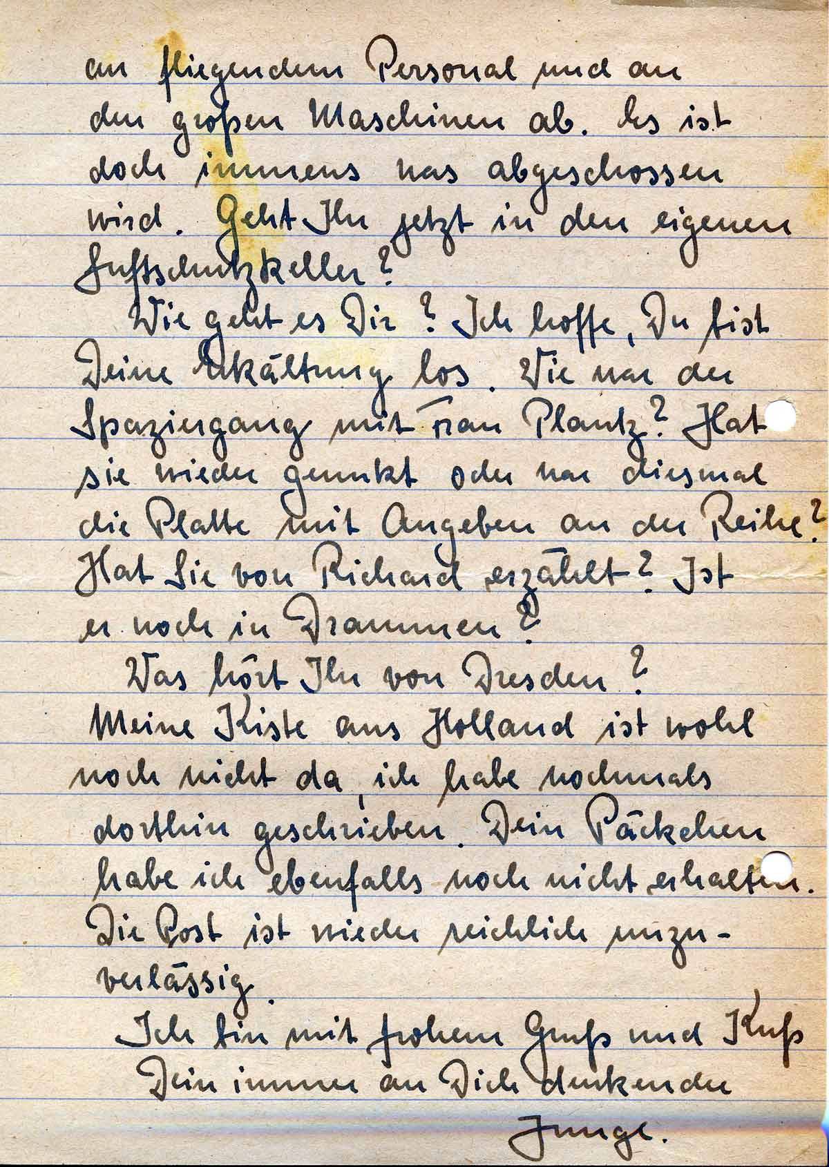 Wie geht es Dir? Ich hoffe, Du bist Deine Erkältung los. Wie war der Spaziergang mit Frau Plantz? Hat sie wieder geunkt oder war diesmal die Platte mit Angeben an der Reihe? Hat Sie von Richard erzählt? Ist er noch in Drammen?