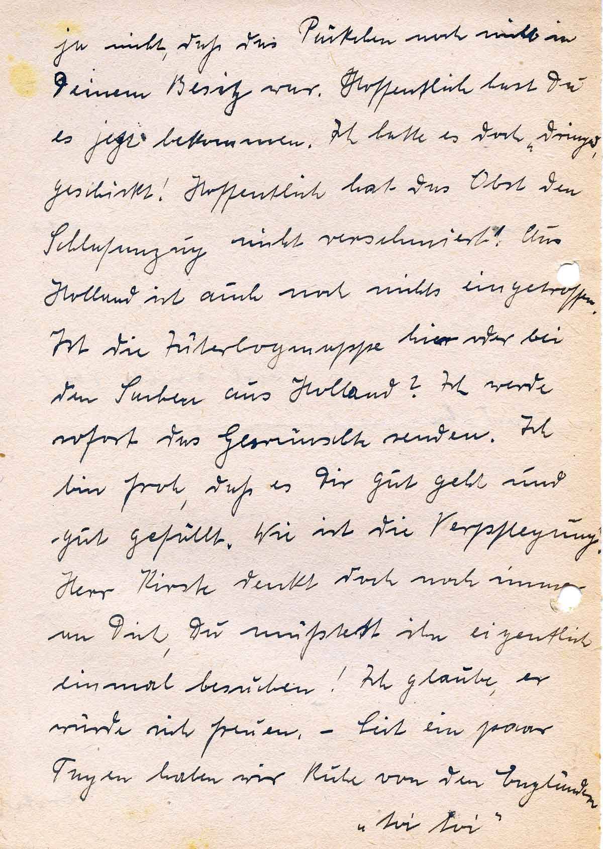ja nicht, daß das Päckchen noch nicht in Deinem Besitz war. Hoffentlich hast Du es jetzt bekommen. Ich hatte es doch „Dringend“ geschickt! Hoffentlich hat das Obst den Schlafanzug nicht verschmiert! Aus Holland ist auch noch nichts eingetroffen. Ist die Jüterbogmappe hier oder bei den Sachen aus Holland? Ich werde sofort das Gewünschte senden. Ich bin froh, daß es Dir gut geht und gut gefällt. Wie ist die Verpflegung? Herr Kirste denkt doch noch immer an Dich, Du müßtest ihn eigentlich einmal besuchen! Ich glaube, er würde sich freuen. – Seit ein paar Tagen haben wir Ruhe von den Engländern „toi toi“