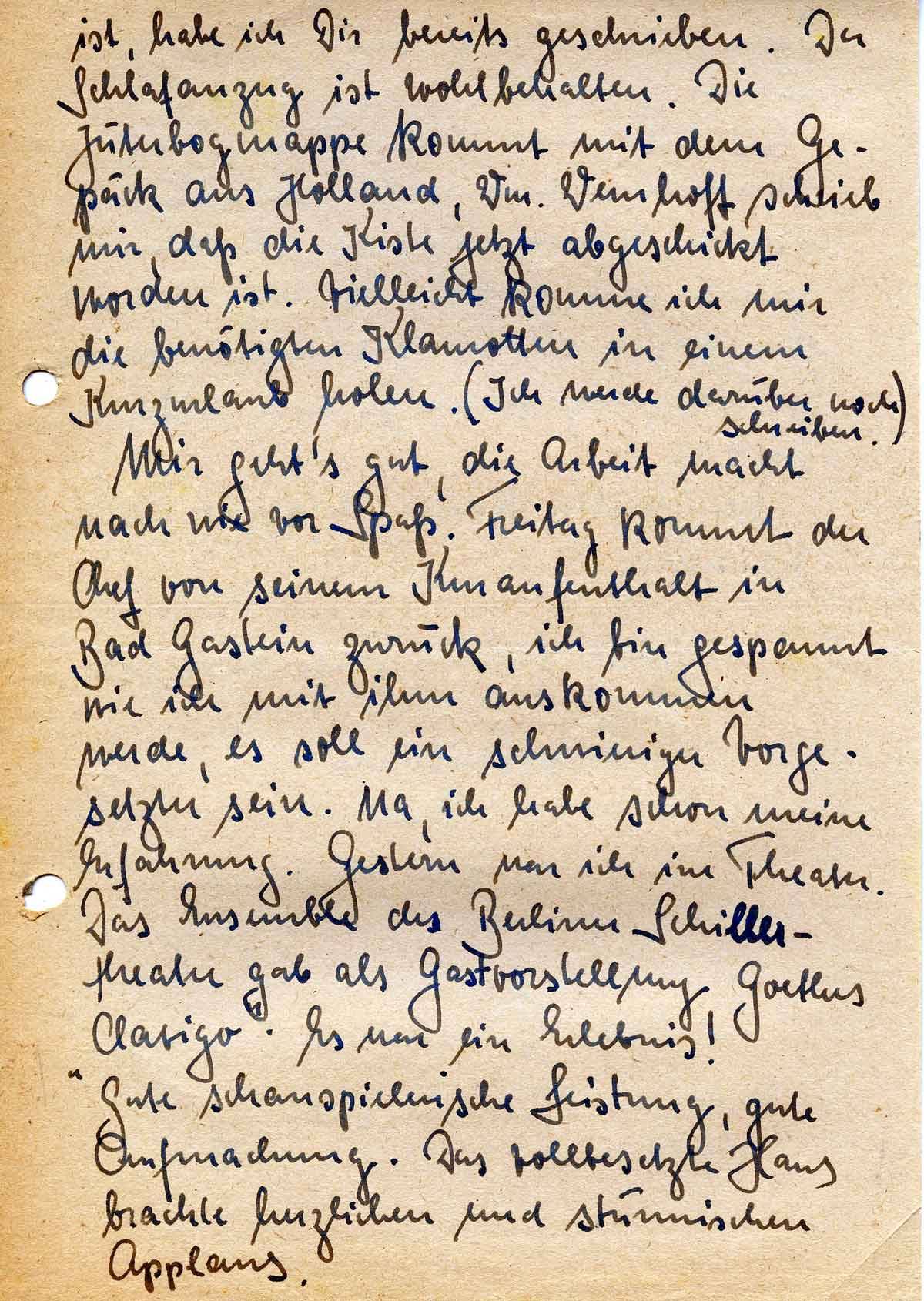 Mir geht’s gut, die Arbeit macht nach wie vor Spaß. Freitag kommt der Chef von seinem Kuraufenthalt in Bad Gastein zurück, ich bin gespannt wie ich mit ihm auskommen werde, es soll ein schwieriger Vorgesetzter sein. Na, ich habe schon meine Erfahrung. Gestern war ich im Theater. Das Ensemble des Berliner Schillertheater gab als Gastvorstellung Goethes „Clavigo“. Es war ein Erlebnis!