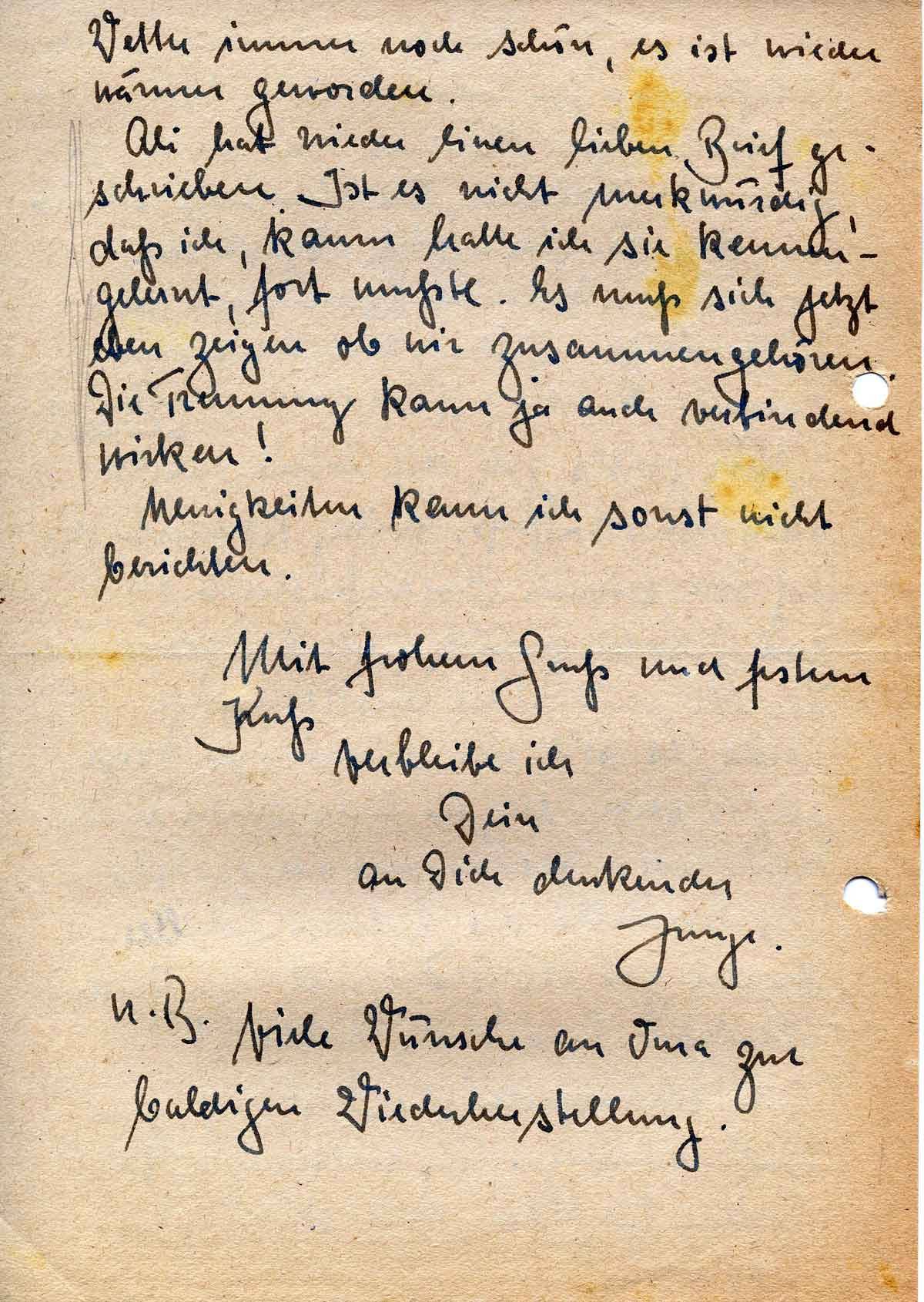 Ali hat wieder einen lieben Brief geschrieben. Ist es nicht merkwürdig, daß ich, kaum hatte ich sie kennengelernt, fort mußte. Es muß sich jetzt eben zeigen ob wir zusammengehören. Die Trennung kann ja auch verbindend wirken!