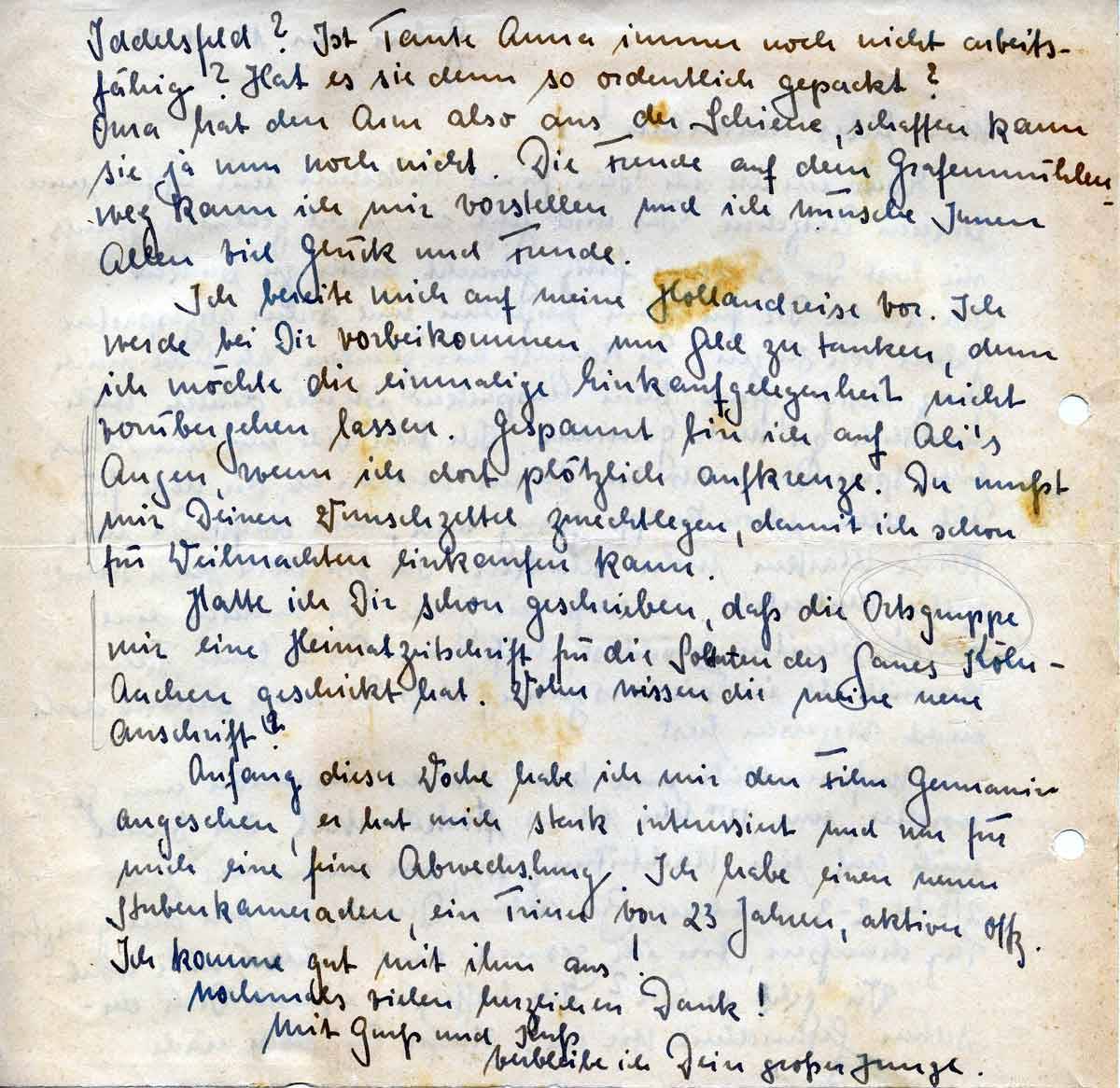Anfang dieser Woche habe ich mir den Film Germanin angesehen, er hat mich stark interessiert und war für mich eine feine Abwechslung. Ich habe einen neuen Stubenkameraden, ein Trierer von 23 Jahren, aktiver Offz. Ich komme gut mit ihm aus!