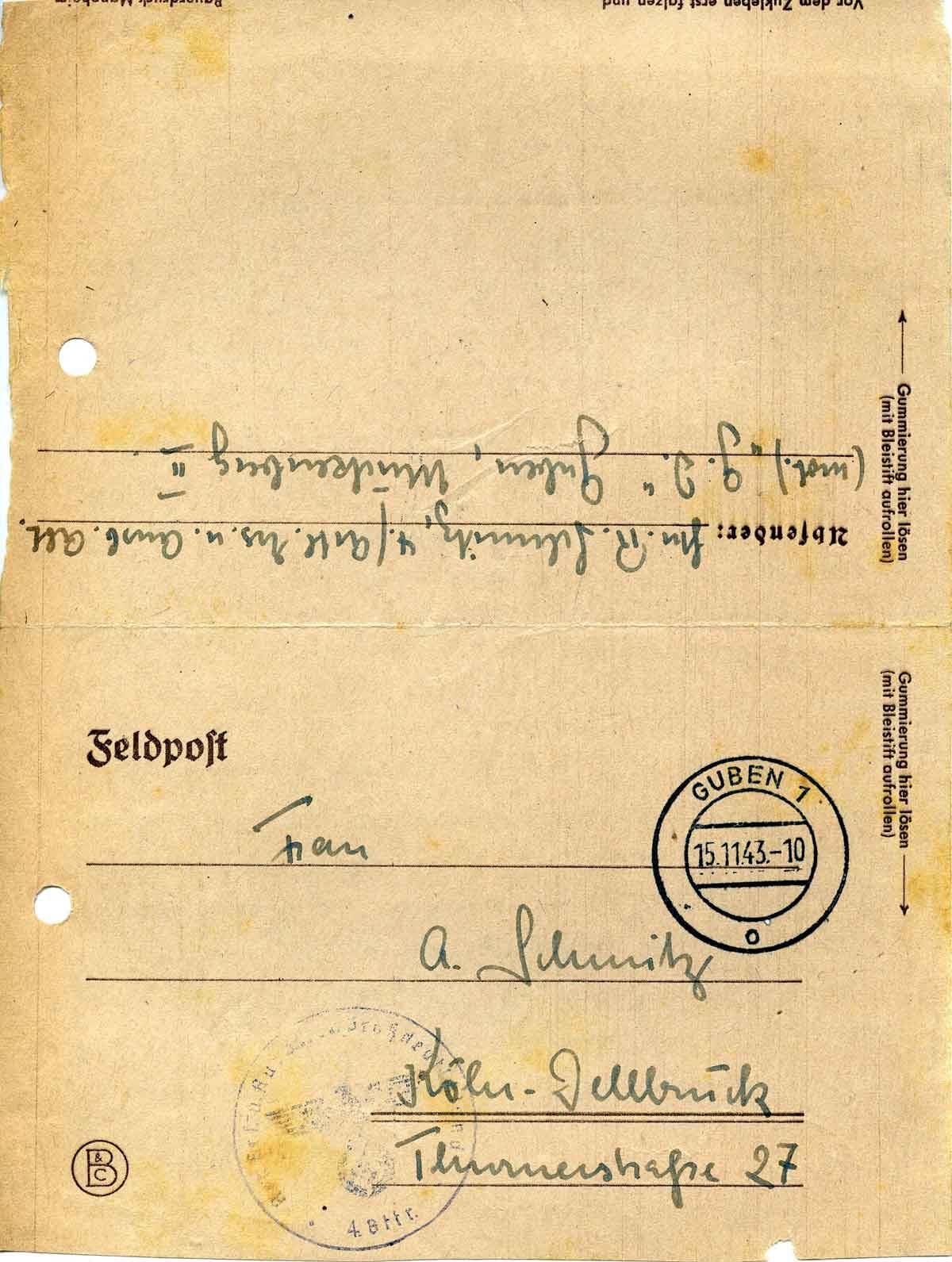 Absender: Ltn. R. Schmitz, 4./Artl. Ers. u. Ausb. Abt.