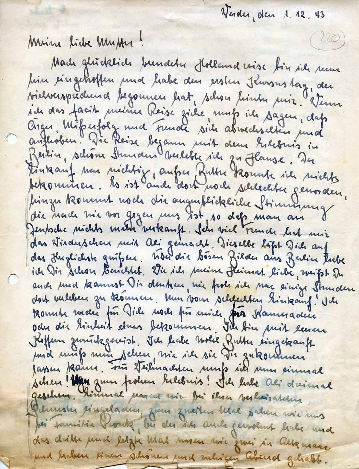 Nach glücklich beendeter Hollandreise bin ich nun hier eingetroffen und habe den ersten Kursustag, der vielversprechend begonnen hat, schon hinter mir. Wenn ich das facit meiner Reise ziehe, muß ich sagen, daß Ärger, Mißerfolg und Freude sich abwechselten und aufhoben. Die Reise begann mit dem Erlebnis in Berlin, schöne Stunden verlebte ich zu Hause. Der Einkauf war nichtig, außer Butter konnte ich nichts bekommen. Es ist auch dort noch schlechter geworden, hinzu kommt noch die augenblickliche Stimmung die nach wie vor gegen uns ist, so daß man an Deutsche nichts mehr verkauft. Sehr viel Freude hat mir das Wiedersehen mit Ali gemacht. Dieselbe läßt Dich auf das Herzlichste grüßen. Über die bösen Bilder aus Berlin habe ich Dir schon berichtet. Wie ich meine Heimat liebe, weißt Du auch und kannst Dir denken, wie froh ich war einige Stunden dort verleben zu können. Nun vom schlechten Einkauf! Ich konnte weder für Dich noch für mich, für Kameraden oder die Einheit etwas bekommen. Ich bin mit leeren Koffern zurückgereist. Ich habe wohl Butter eingekauft und muß nun sehen, wie ich sie Dir zukommen lassen kann. Für Weihnachten muß ich nun einmal sehen! Nun zum frohen Erlebnis! Ich habe Ali dreimal gesehen. Einmal waren wir bei ihrer verheirateten Schwester eingeladen, zum zweiten Mal sahen wir uns bei Familie Pronk, bei der ich auch gewohnt habe und das dritte und letzte Mal waren wir zwei in Alkmaar und haben einen schönen und ruhigen Abend gehabt.