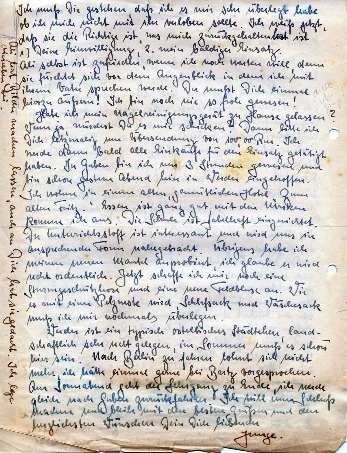 Werder ist ein typisch ostelbisches Städtchen, landschaftlich sehr nett gelegen, im Sommer muß es schön hier sein. Nach Berlin zu fahren lohnt sich nicht mehr, ich hätte einmal gerne bei Bartz vorgesprochen. Am Sonnabend geht der Lehrgang zu Ende, ich werde gleich nach Guben zurückfahren. Ich will nun Schluß machen und bleibe mit den besten Grüßen und den herzlichsten Wünschen Dein Dich liebender