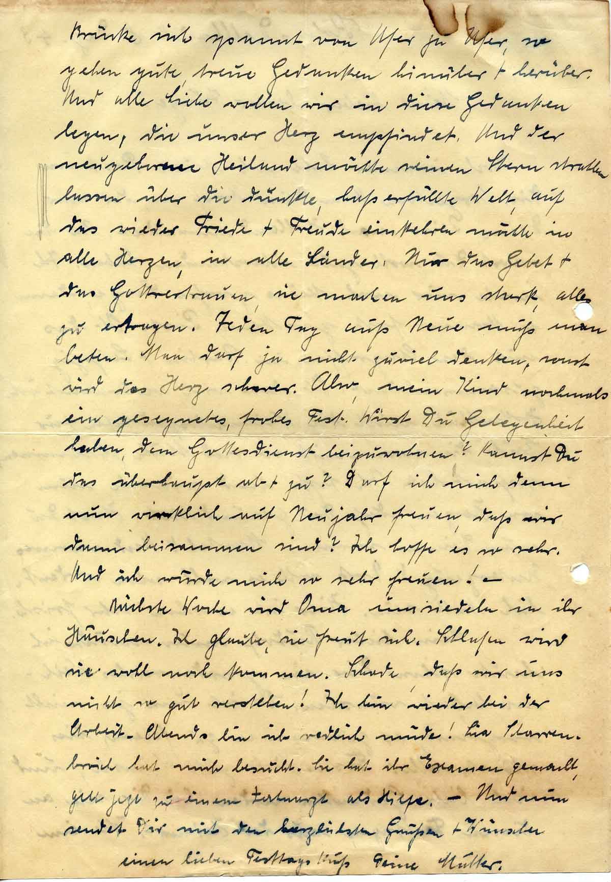 Brücke sich spannt von Ufer zu Ufer, so gehen gute, treue Gedanken hinüber + herüber. Und alle Liebe wollen wir in diese Gedanken legen, die unser Herz empfindet. Und der neugeborene Heiland möchte seinen Stern strahlen lassen über die dunkle, haßerfüllte Welt, auf das wieder Friede + Freude einkehren möchte in alle Herzen, in alle Länder. Nur das Gebet + das Gottvertrauen, sie machen uns stark, alles zu ertragen. Jeden Tag aufs Neue muß man beten. Man darf ja nicht zuviel denken, sonst wird das Herz schwer. Also, mein Kind nochmals ein gesegnetes, frohes Fest. Wirst Du Gelegenheit haben, dem Gottesdienst beizuwohnen? Kannst Du das überhaupt ab + zu? Darf ich mich denn nun wirklich auf Neujahr freuen, daß wir dann beisammen sind? Ich hoffe es so sehr. Und ich würde mich so sehr freuen! –