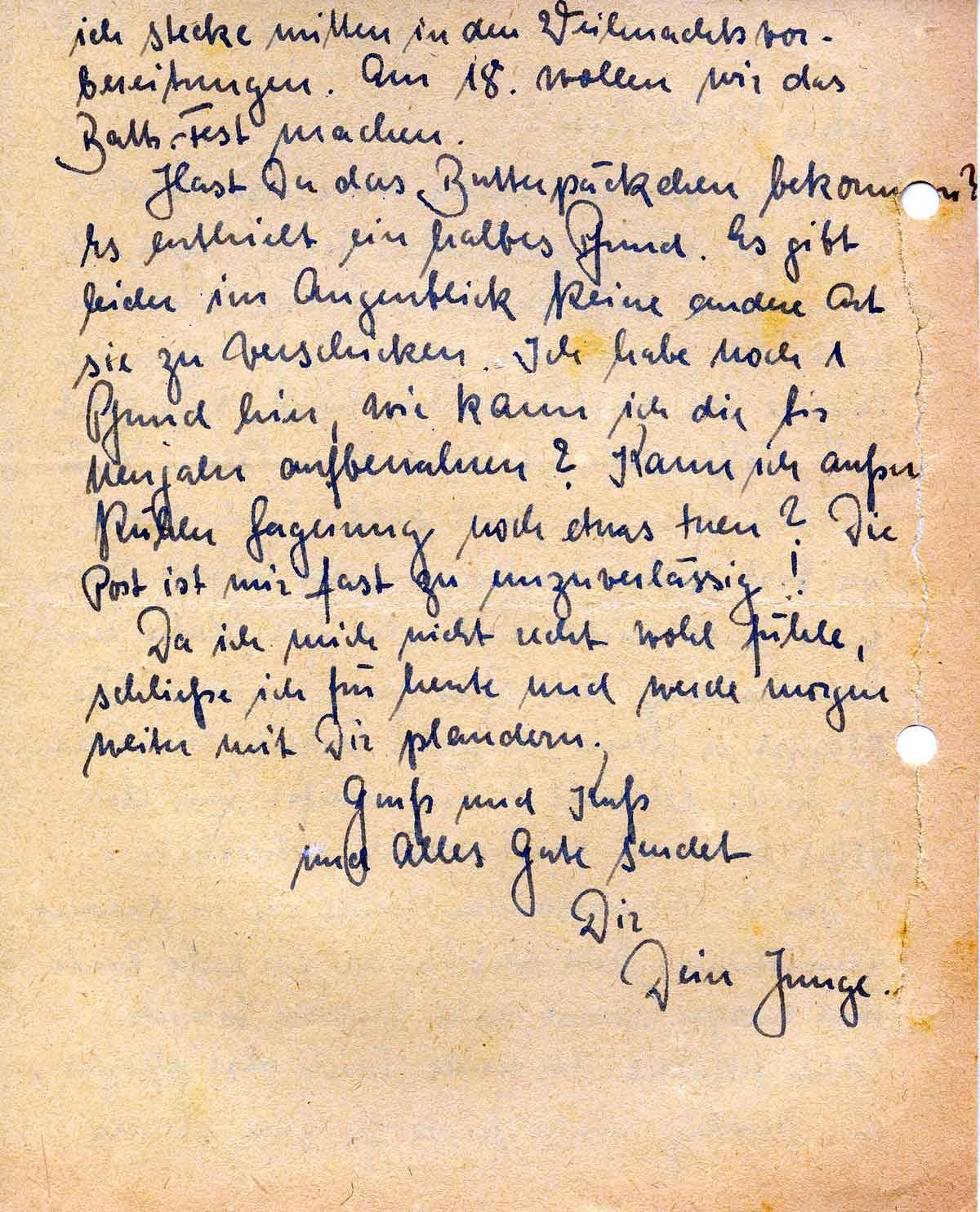 Hast Du das Butterpäckchen bekommen? Es enthielt ein halbes Pfund. Es gibt leider im Augenblick keine andere Art sie zu verschicken. Ich habe noch 1 Pfund hier, wie kann ich die bis Neujahr aufbewahren? Kann ich außer kühler Lagerung noch etwas tuen? Die Post ist mir fast zu unzuverlässig!