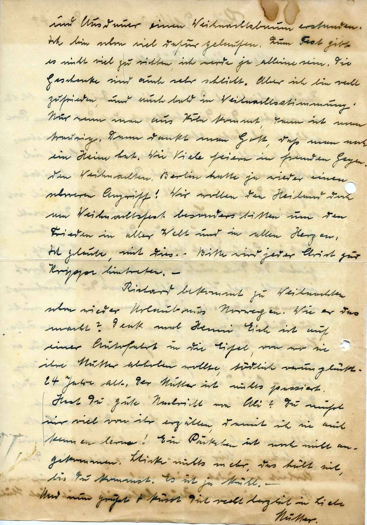 und Ausdauer einen Weihnachtsbaum erstanden. Ich bin schon viel dafür gelaufen. Zum Fest gibt es nicht viel zu richten, ich werde ja alleine sein. Die Geschenke sind auch sehr schlicht. Aber ich bin recht zufrieden, und auch bald in Weihnachtsstimmung. Nur wenn man aus Köln kommt, dann ist man traurig. Dann dankt man Gott, daß man noch ein Heim hat. Wie Viele feiern in fremden Gegenden Weihnachten. Berlin hatte ja wieder einen schweren Angriff! Wir wollen den Heiland doch am Weihnachtsfest besonders bitten um den Frieden in aller Welt und in allen Herzen. Ich glaube, mit dieser Bitte wird jeder Christ zur Krippe hintreten. –