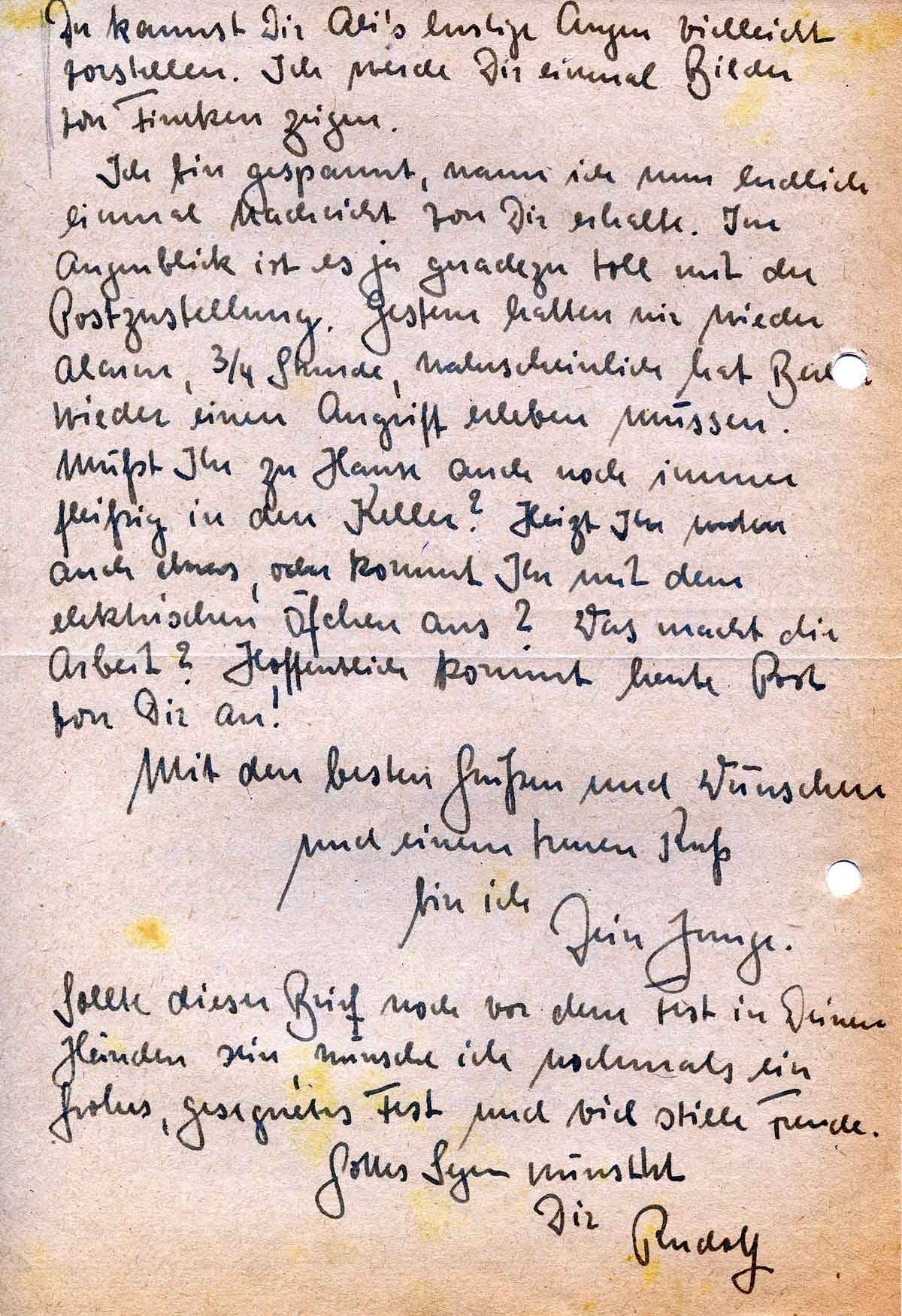 Ich bin gespannt, wann ich nun endlich einmal Nachricht von Dir erhalte. Im Augenblick ist es ja geradezu toll mit der Postzustellung. Gestern hatten wir wieder Alarm, ¾ Stunde, wahrscheinlich hat Berlin wieder einen Angriff erleben müssen. Müßt Ihr zu Hause auch noch immer fleißig in den Keller? Heizt Ihr unten auch etwas, oder kommt Ihr mit dem elektrischen Öfchen aus? Was macht die Arbeit? Hoffentlich kommt heute Post von Dir an!