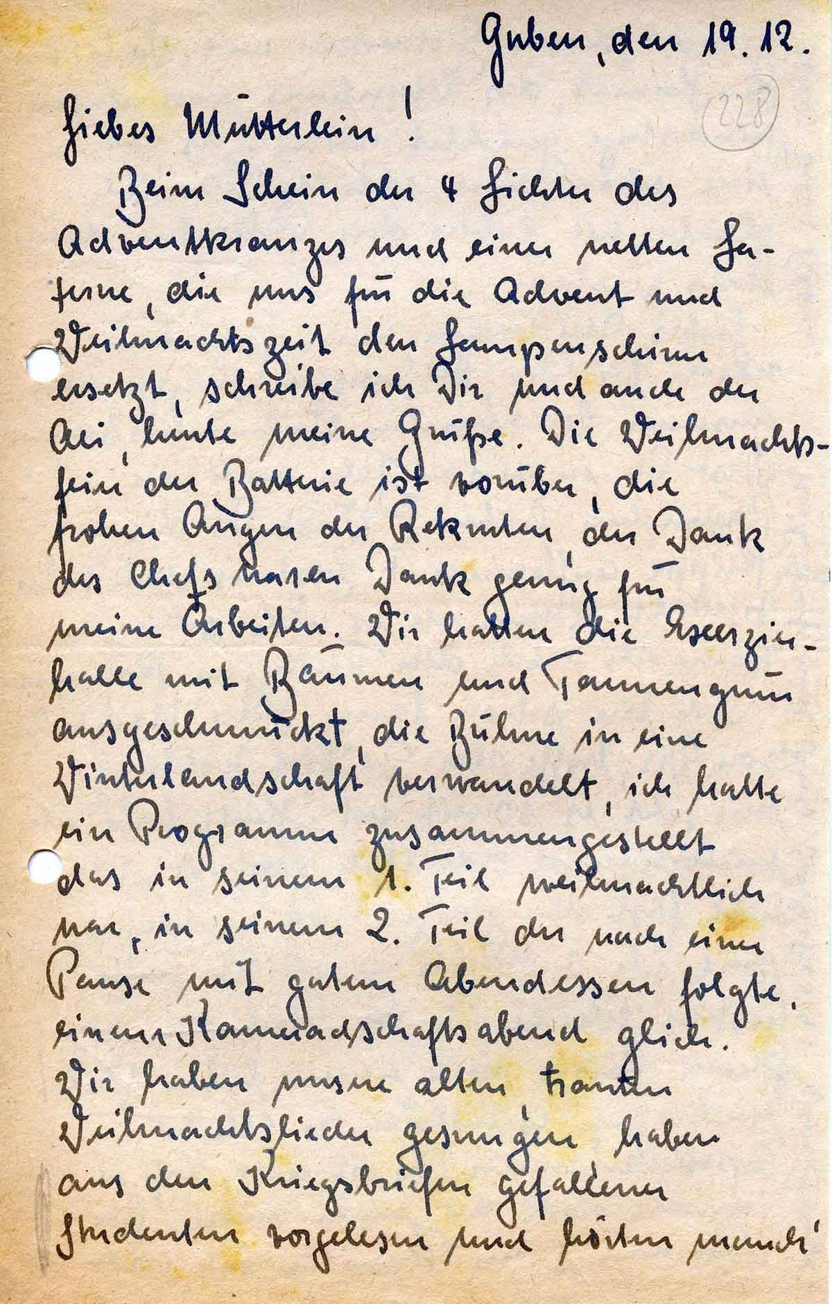 Beim Schein der 4 Lichter des Adventkranzes und einer netten Laterne, die uns für die Advent und Weihnachtszeit den Lampenschirm ersetzt, schreibe ich Dir und auch der Ali, heute meine Grüße. Die Weihnachtsfeier der Batterie ist vorüber, die frohen Augen der Rekruten, der Dank des Chefs waren Dank genug für meine Arbeiten. Wir hatten die Exerzierhalle mit Bäumen und Tannengrün ausgeschmückt, die Bühne in eine Winterlandschaft verwandelt, ich hatte ein Programm zusammengestellt das in seinem 1. Teil weihnachtlich war, in seinem 2. Teil der nach einer Pause mit gutem Abendessen folgte, einem Kameradschaftsabend glich. Wir haben unsere alten, trauten Weihnachtslieder gesungen, haben aus den Kriegsbriefen gefallener Studenten vorgelesen und hörten manch‘