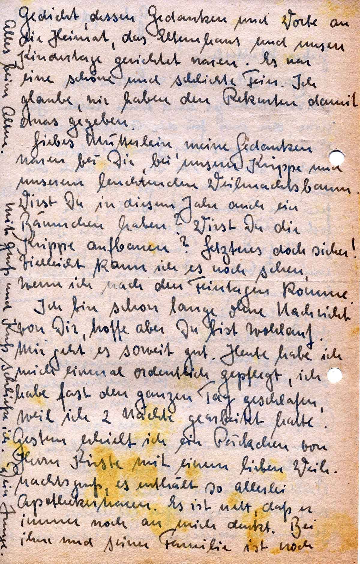 Liebes Mütterlein, meine Gedanken waren bei Dir, bei unserer Krippe und unserem leuchtenden Weihnachtsbaum. Wirst Du in diesem Jahr auch ein Bäumchen haben? Wirst Du die Krippe aufbauen? Letzteres doch sicher! Vielleicht kann ich es noch sehen, wenn ich nach den Feiertagen komme.
