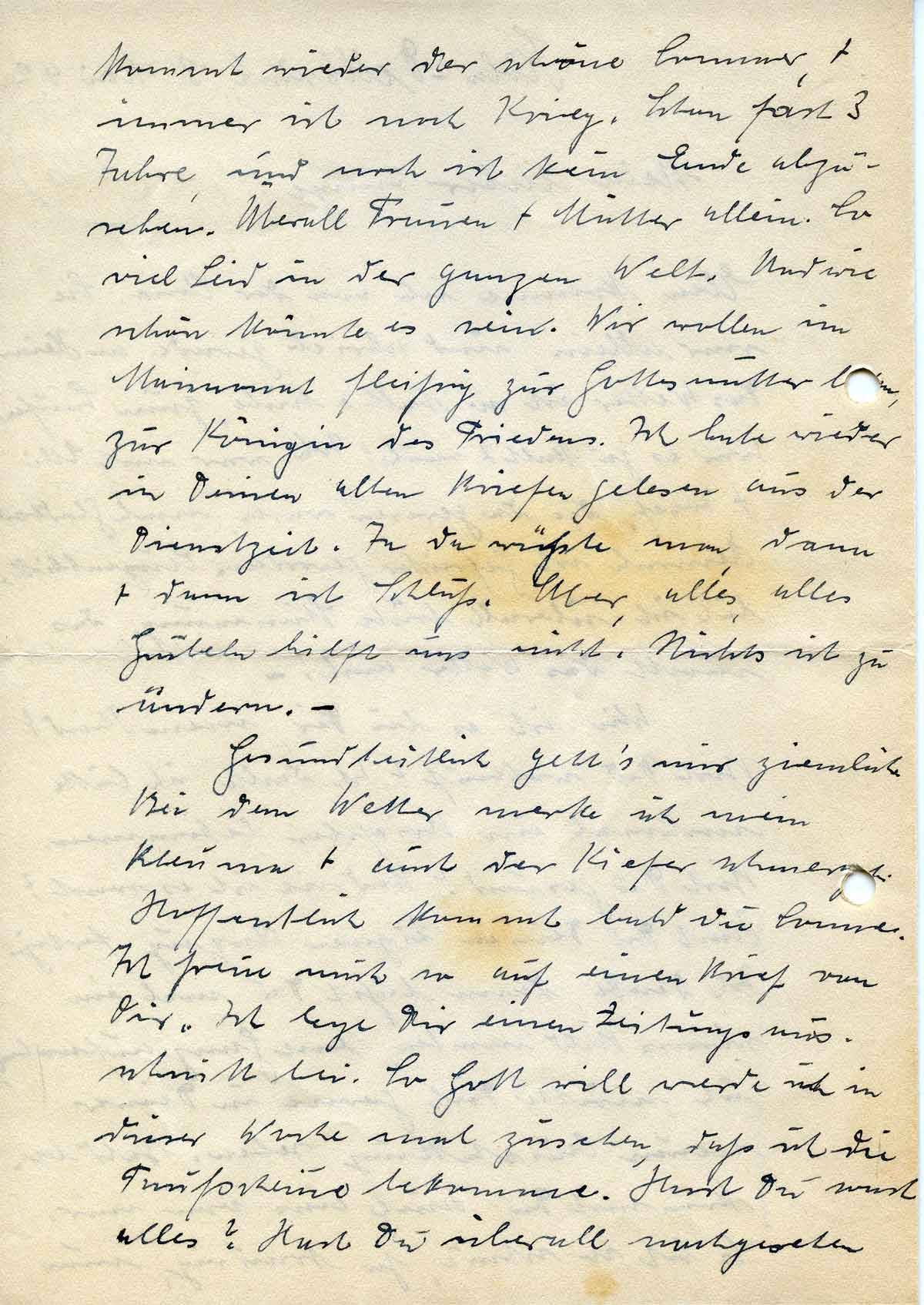 kommt wieder der schöne Sommer, + immer ist noch Krieg. Schon fast 3 Jahre, und noch ist kein Ende abzusehen. Überall Frauen + Mütter allein. So viel Leid in der ganzen Welt. Und wie schön könnte es sein. Wir wollen im Maienmonat fleißig zur Gottesmutter beten, zur Königin des Friedens. Ich habe wieder in Deinen alten Briefen gelesen aus der Dienstzeit. Ja da wüßte man, dann + dann ist Schluß. Aber, alles, alles Grübeln hilft uns nicht. Nichts ist zu ändern. –