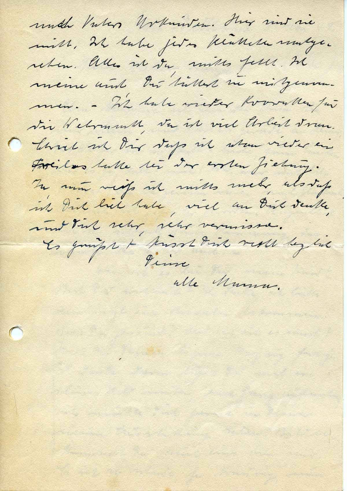 nach Vaters Urkunden. Hier sind sie nicht. Ich habe jedes [..] nachgesehen. Alles ist da, nichts fehlt. Ich meine auch, Du hättest sie mitgenommen. – Ich habe wieder Krawatten für die Wehrmacht, da ist viel Arbeit dran. Schrieb ich Dir daß ich schon wieder ein Freilos hatte bei der ersten Ziehung. Ja, nun weiß ich nichts mehr, als daß ich Dich lieb habe, viel an Dich denke, und Dich sehr, sehr vermisse.