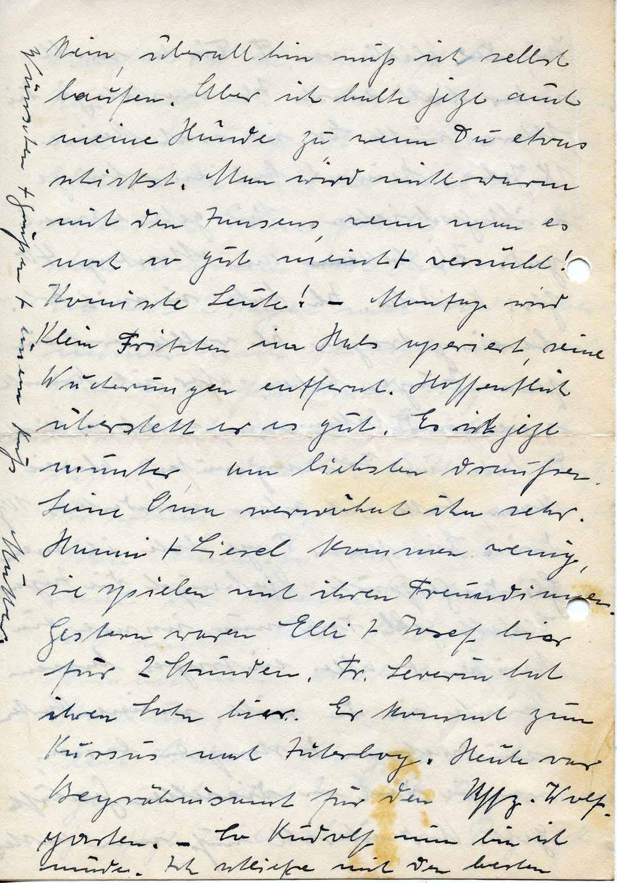 Nein, überallhin muß ich selbst laufen. Aber ich halte jetzt auch meine Hände zu, wenn Du etwas schickst. Man wird nicht warm mit den Jansens, wenn man es noch so gut meint + versucht! Komische Leute! – Montag wird Klein Fritzchen im Hals operiert, seine Wucherungen entfernt. Hoffentlich übersteht er es gut. Er ist jetzt munter, am liebsten draußen. Seine Oma verwöhnt ihn sehr. Hanni + Liesel kommen wenig, sie spielen mit ihren Freundinnen. Gestern waren Elli + Josef hier für 2 Stunden. Fr. Severin hat ihren Sohn hier. Er kommt zum Kursus nach Jüterbog. Heute war Begräbnisamt für den Uffz. Wolfgarten. – So Rudolf nun bin ich müde. Ich schließe mit den besten