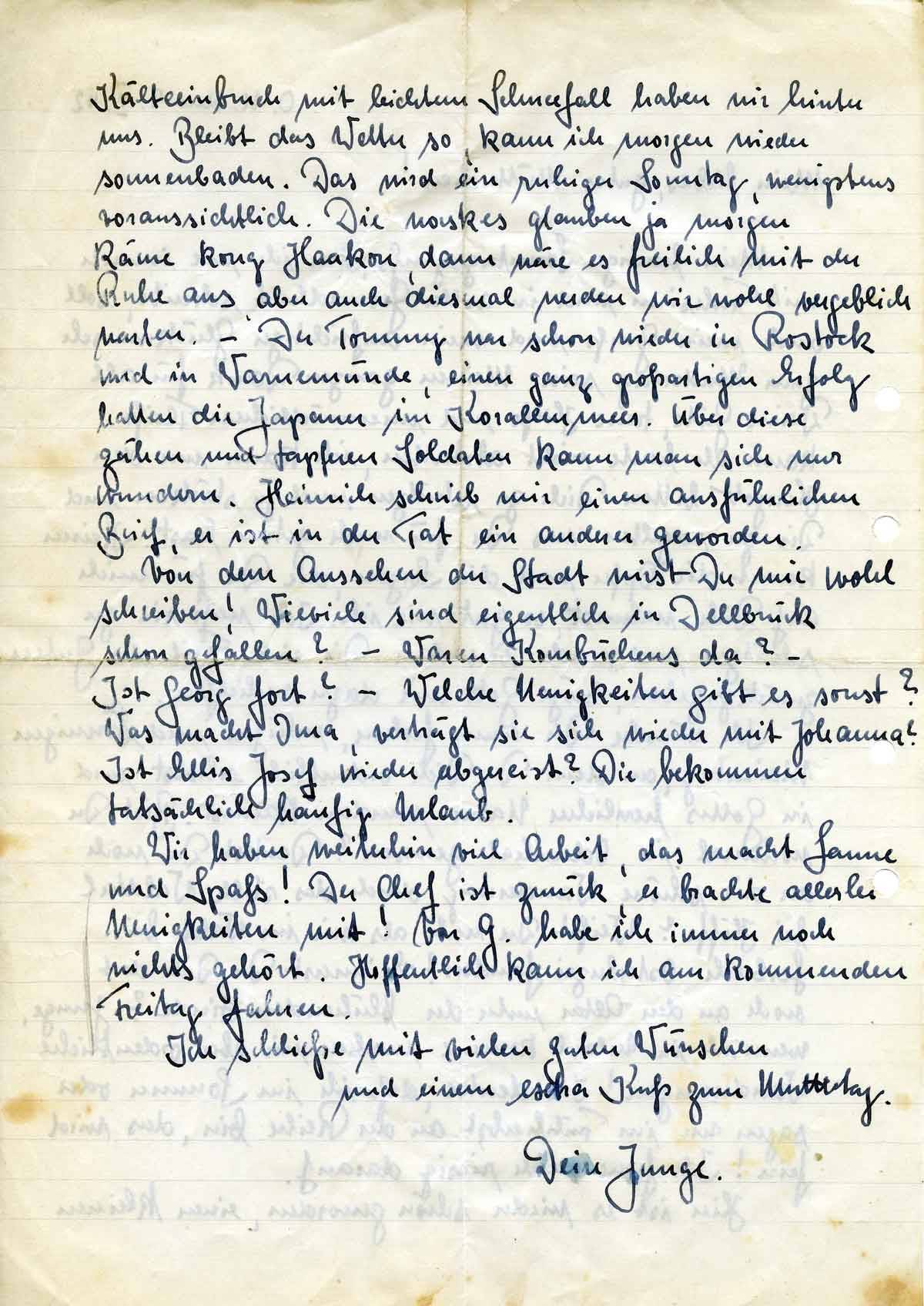 Kälteeinbruch mit leichtem Schneefall haben wir hinter uns. Bleibt das Wetter so, kann ich morgen wieder sonnenbaden. Das wird ein ruhiger Sonntag, wenigstens voraussichtlich. Die norskes glauben ja morgen käme Kong Haakon, dann wäre es freilich mit der Ruhe aus, aber auch diesmal werden wir wohl vergeblich warten. – Der Tommy war schon wieder in Rostock und in Warnemünde, einen ganz großartigen Erfolg hatten die Japaner im Korallenmeer. Über diese zähen und tapferen Soldaten kann man sich nur wundern. Heinrich schrieb mir einen ausführlichen Brief, er ist in der Tat ein anderer geworden.