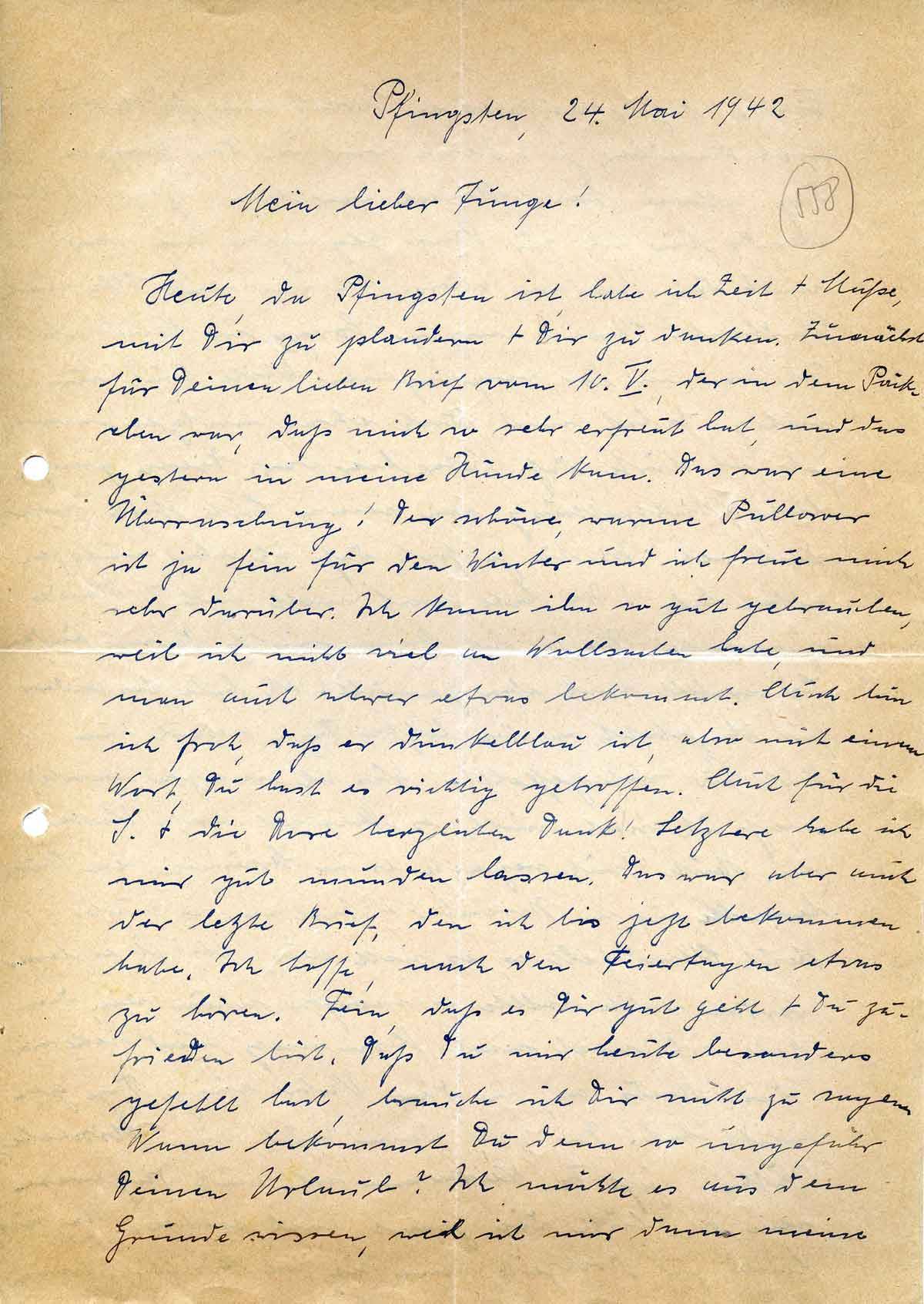 lassen. Na, nun genug davon. – Habt Ihr die Pfingsttage gut gelebt? Und was hast Du angefangen. Warst Du in G.? Wie geht’s dort. Bitte bestelle viele Grüße dahin. Diese Woche muß ich zum Zahnarzt, dann nimmt er Maß für neue Zähne. Hoffentlich habe ich sie, wenn Du in Urlaub kommst! Ich freue mich ja sehr darauf! Überhaupt auch auf Deinen nächsten Brief. Darum hat mir das Päckchen auch so viele Freude gemacht, weil ich sehe, daß ich doch jemand habe, der zu mir gehört + mich gern hat + mir gut ist, gelt, mein Junge? Wir wollen zusammen halten! Alles, wie Gott es will! Und nun für
