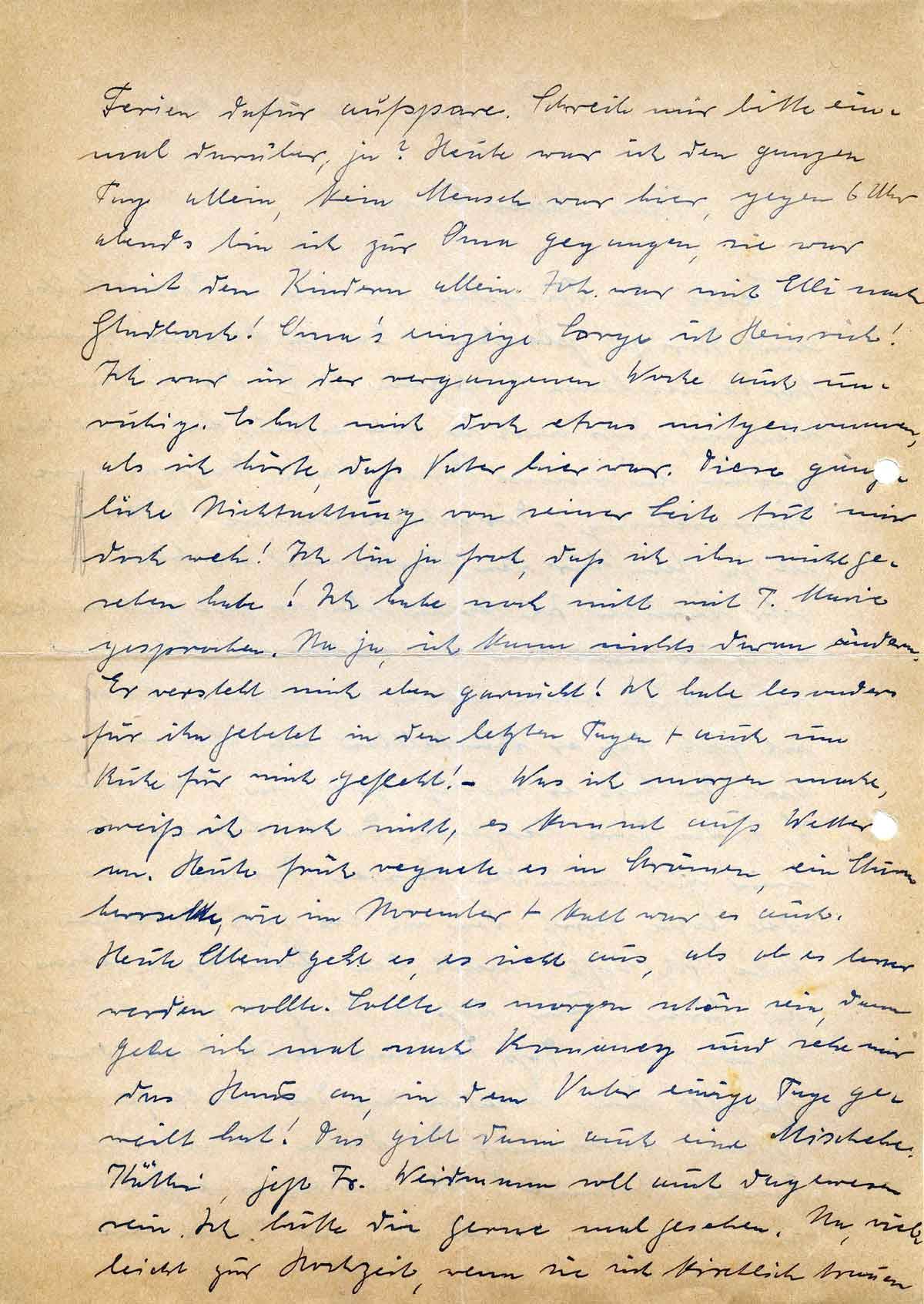 Ferien dafür aufspare. Schreib mir bitte einmal darüber, ja? Heute war ich den ganzen Tag allein, kein Mensch war hier, gegen 6 Uhr abends bin ich zur Oma gegangen, sie war mit den Kindern allein. Joh. war mit Elli nach Gladbach! Oma’s einzige Sorge ist Heinrich! Ich war in der vergangenen Woche auch unruhig. Es hat mich doch etwas mitgenommen, als ich hörte, daß Vater hier war. Diese gänzliche[?] Nichtachtung von seiner Seite tut mir doch weh! Ich bin ja froh, daß ich ihn nicht gesehen habe! Ich habe noch nicht mit T. Marie gesprochen. Na ja, ich kann nichts daran ändern. Er versteht mich eben garnicht! Ich habe besonders für ihn gebetet in den letzten Tagen + auch um Ruhe für mich gefleht! – Was ich morgen mache, weiß ich noch nicht, es kommt aufs Wetter an. Heute früh regnete es in Strömen, ein Sturm herrschte, wie im November + kalt war es auch.