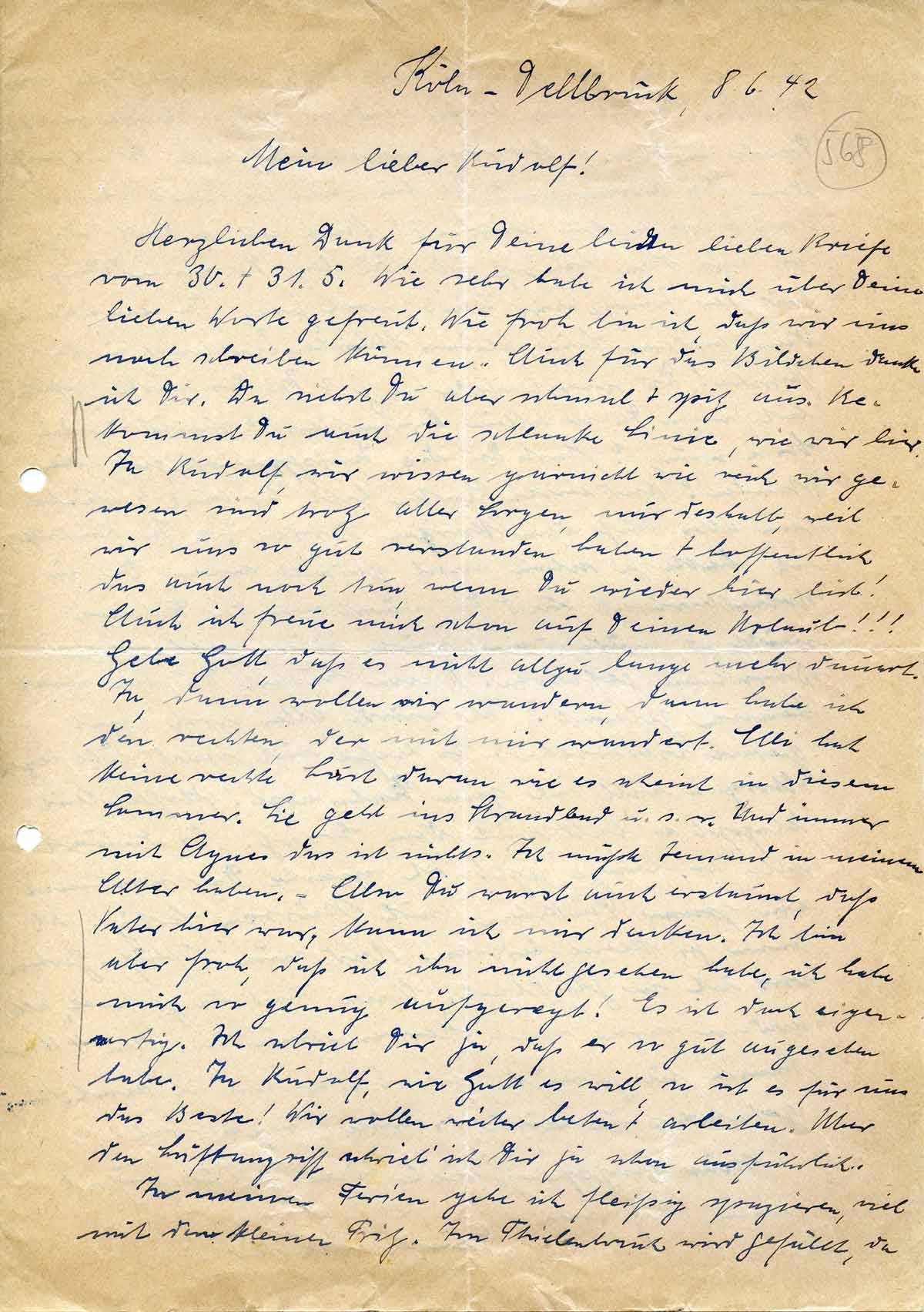 Herzlichen Dank für Deine beiden lieben Briefe vom 30. + 31.5. Wie sehr habe ich mich über Deine lieben Worte gefreut. Wie froh bin ich, daß wir uns noch schreiben können. Auch für das Bildchen danke ich Dir. Da siehst Du aber schmal + spitz aus. Bekommst Du auch die schlanke Linie, wie wir hier. Ja Rudolf, wir wissen garnicht wie reich wir gewesen sind trotz aller Sorgen, nur deshalb, weil wir uns so gut verstanden haben + hoffentlich das auch noch tun, wenn Du wieder hier bist! Auch ich freue mich schon auf Deinen Urlaub!!! Gebe Gott, daß es nicht allzu lange mehr dauert. Ja, dann wollen wir wandern, dann habe ich den rechten, der mit mir wandert. Elli hat keine rechte Lust daran wie es scheint in diesem Sommer. Sie geht ins Strandbad u.s.w. Und immer mit Agnes das ist nichts. Ich müßte Jemand in meinem Alter haben. – Also Du warst auch erstaunt, daß Vater hier war, kann ich mir denken. Ich bin aber froh, daß ich ihn nicht gesehen habe, ich habe mich so genug aufgeregt! Es ist doch eigenartig. Ich schrieb Dir ja, daß er so gut ausgesehen habe. Ja Rudolf, wie Gott es will, so ist es für uns das Beste! Wir wollen weiter beten + arbeiten. Über den Luftangriff schrieb‘ ich Dir ja schon ausführlich.