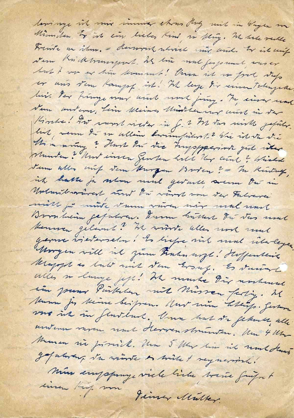 bringe ich mir immer etwas Holz mit im Wagen von Männchen. Es ist ein liebes Kind, so klug. Ich habe rechte Freude mit ihm. – Heinrich schrieb mir auch. Er ist auf dem Rücktransport. Ich bin mal gespannt, was er hat + wo er hin kommt! Oma ist so froh, daß er aus dem Kampf ist! Ich lege Dir einen Totenzettel bei. Der Junge war auch noch jung. Ja, einer nach dem andern. Sein kleines Mädchen war auch in der Kirche! Du warst wieder in G.? Ist das nicht gefährlich, wenn Du so allein herumfährst? Wie ist da die Stimmung? Hast Du die Impfperiode gut überstanden? Und einen Garten habt Ihr auch? Wächst denn alles auf dem kargen Boden? – Ja Rudolf, ich hatte ja schon mal gedacht, wenn Du in Urlaub wärest, und Du wärst von der Fahrerei nicht zu müde, dann wären wir mal nach Bornheim gefahren. Dann hättest Du das mal kennen gelernt? Ich würde alles noch mal gerne wiedersehen! Es ließe sich mal überlegen. Morgen will ich zum Zahnarzt! Hoffentlich klappt es bald mit dem Ersatz. Es dauert alles so lange jetzt! Ich mache Dir nochmal ein paar Päckchen mit Nüssen fertig. Ich kann ja keine beißen. Und nun Schluß. Gestern war ich in Gladbach. Oma hat da gekocht, alle andern waren nach Herrenstrunden. Um 4 Uhr kamen sie zurück. Um 5 Uhr bin ich nach Haus gefahren, da wurde es trübe + regnerisch!