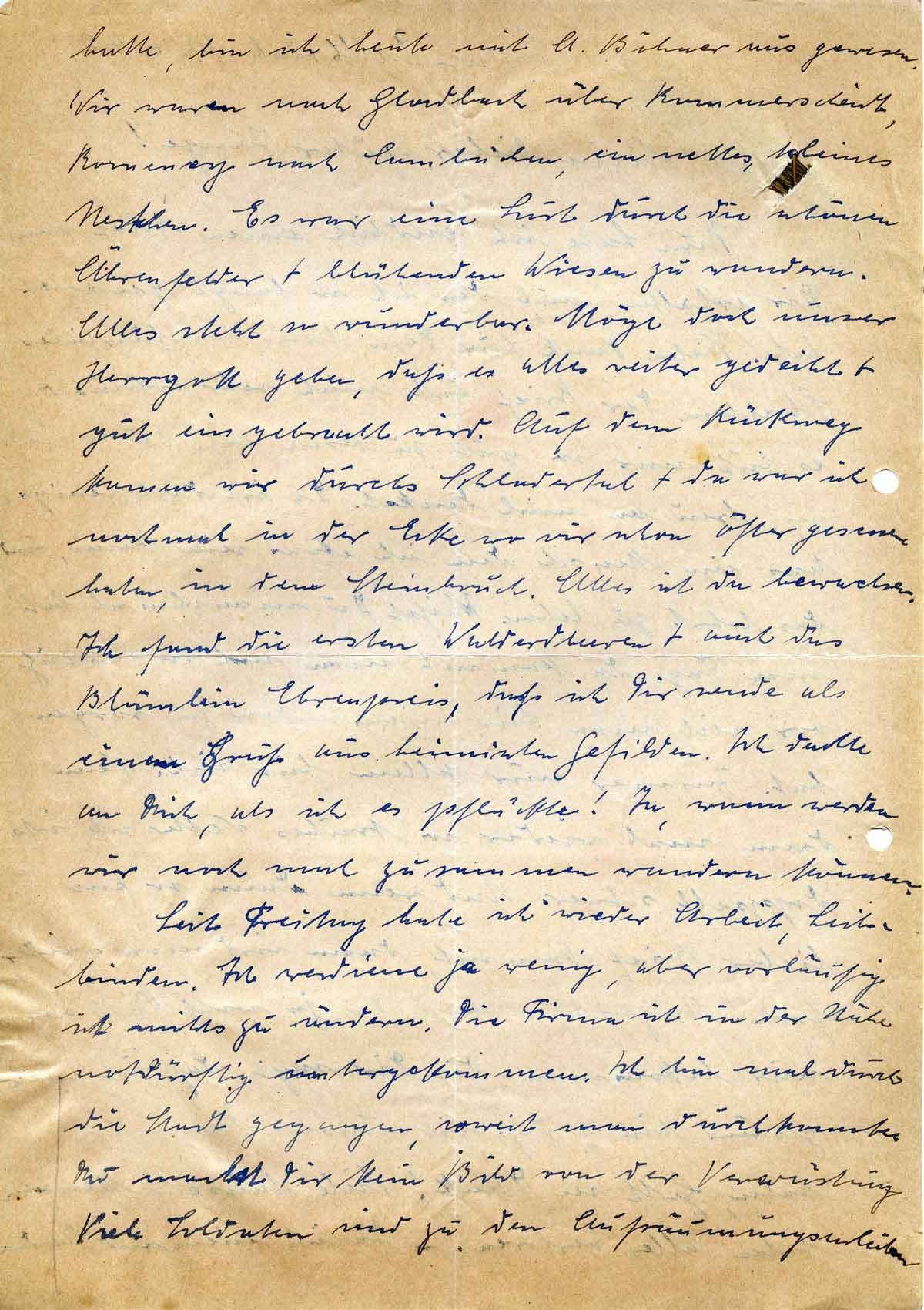hatte, bin ich heute mit A. Böhner aus gewesen. Wir waren nach Gladbach über Rommerscheidt, Romeney und Combüchen, ein nettes, kleines Nestchen. Es war eine Lust durch die schönen Ährenfelder + blühenden Wiesen zu wandern. Alles steht so wunderbar. Möge doch unser Herrgott geben, daß es alles weiter gedeiht + gut eingebracht wird. Auf dem Rückweg kamen wir durchs Schladertal + da war ich nochmal in der Ecke wo wir schon öfter gesessen haben, in dem Steinbruch. Alles ist da bewachsen. Ich fand die ersten Walderdbeeren + auch das Blümlein Ehrenpreis, daß ich Dir sende als einen Gruß aus heimischen Gefilden. Ich dachte an Dich, als ich es pflückte! Ja, wann werden wir noch mal zusammen wandern können.