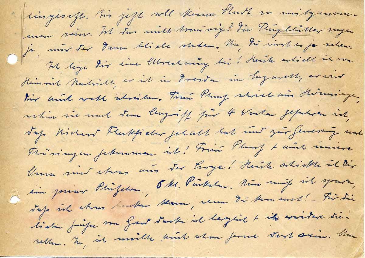 Ich lege Dir eine Abrechnung bei! Heute erhielt ich von Heinrich Nachricht, er ist in Dresden im Lazarett, er wird Dir auch wohl schreiben. Frau Plantz schrieb aus Hönningen, wohin sie nach dem Angriff für 4 Wochen gefahren ist, daß Richard Fleckfieber gehabt hat und zur Genesung nach Thüringen gekommen ist! Frau Plantz + auch unsere Oma sind etwas aus der Sorge! Heute schickte ich Dir ein paar Plätzchen, 5 kl. Päckchen. Nun muß ich sparen, daß ich etwas backen kann, wenn Du kommst! – Für die lieben Grüße von Gerd danke ich herzlich + erwidere dieselben. Ja, ich möchte auch schon gerne dort sein. Man