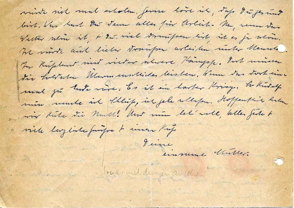 würde sich mal erholen. Gerne höre ich, daß Du gesund bist. Was hast Du denn alles für Arbeit. Na, wenn das Wetter schön ist, + Du viel draußen bist, ist es ja schön. Ich würde auch lieber draußen arbeiten unter Menschen. In Rußland sind wieder schwere Kämpfe. Dort müssen die Soldaten Übermenschliches leisten. Wenn das dort einmal zu Ende wäre. Es ist ein harter Krieg. So Rudolf nun mache ich Schluß, ich gehe schlafen. Hoffentlich haben wir Ruhe die Nacht! Und nun leb‘ wohl, alles Gute + viele herzliche Grüße + einen Kuß