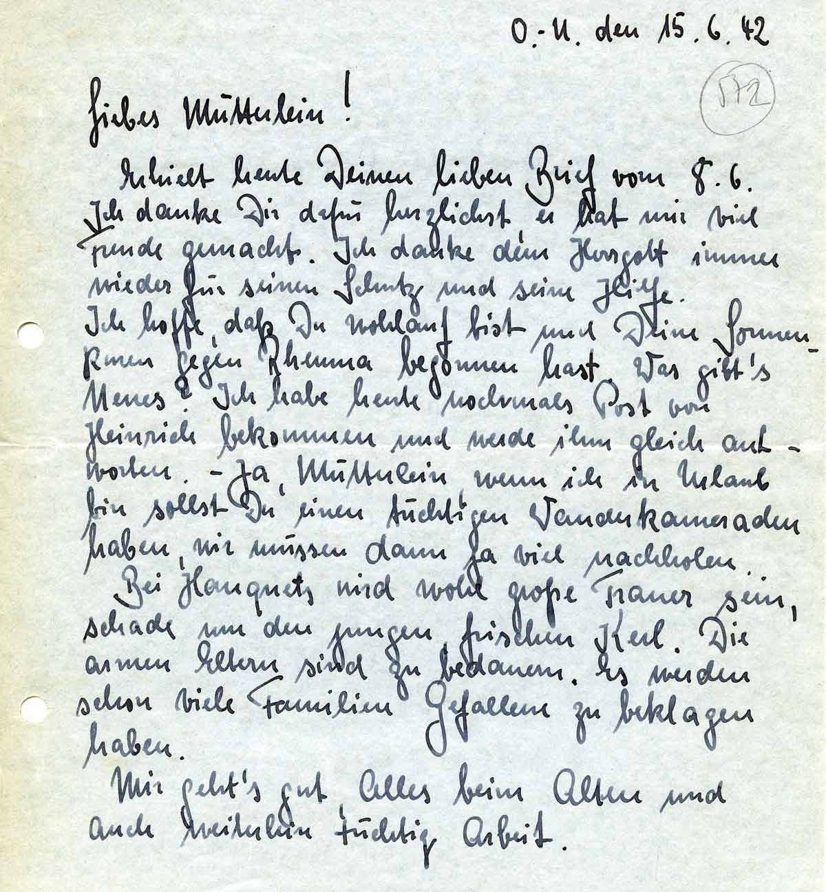 Rudolf Schmitz an Mutter Anna, 15. Juni 1942