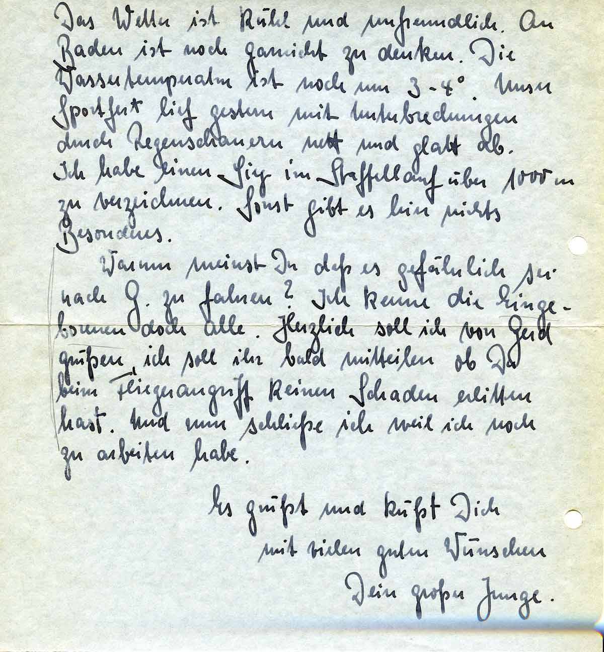 Das Wetter ist kühl und unfreundlich. An Baden ist noch garnicht zu denken. Die Wassertemperatur ist noch um 3-4°. Unser Sportfest lief gestern mit Unterbrechungen durch Regenschauern nett und glatt ab. Ich habe einen Sieg im Staffellauf über 1000 m zu verzeichnen. Sonst gibt es hier nichts Besonderes.