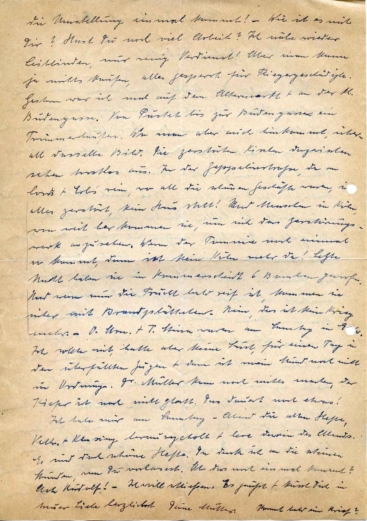 die Umstellung einmal kommt! – Wie ist es mit Dir? Hast Du noch viel Arbeit? Ich nähe wieder Leibbinden, nur wenig Verdienst! Aber man kann ja nichts kaufen, alles gesperrt für Fliegergeschädigte. Gestern war ich mal auf dem Altermarkt + an der kl. Budengasse. Von Pustet bis zur Budengasse ein Trümmerhaufen. Wo man aber auch hinkommt, überall dasselbe Bild. Die zerstörten Kirchen dazwischen sehen trostlos aus. In der Zeppelinstraße, da an Cords + Erbs‘ rein, wo all die schönen Geschäfte waren, ist alles zerstört, kein Haus steht! Und Menschen in Köln, von weit her kommen sie, um sich das Zerstörungswerk anzusehen. Wenn der Tommie noch einmal so kommt, dann ist kein Köln mehr da! Letzte Nacht haben sie in Rommerscheidt 6 Bomben geworfen. Und wenn nun die Frucht bald reif ist, kommen sie sicher mit Brandplättchen. Nein, das ist kein Krieg mehr. – O. Arn. + T. Stina waren am Samstag in [..]. Ich sollte mit, hatte aber keine Lust, für einen Tag in den überfüllten Zügen + dann ist mein Mund noch nicht in Ordnung. Dr. Müller kann noch nichts machen, der Kiefer ist noch nicht glatt. Das dauert noch etwas!