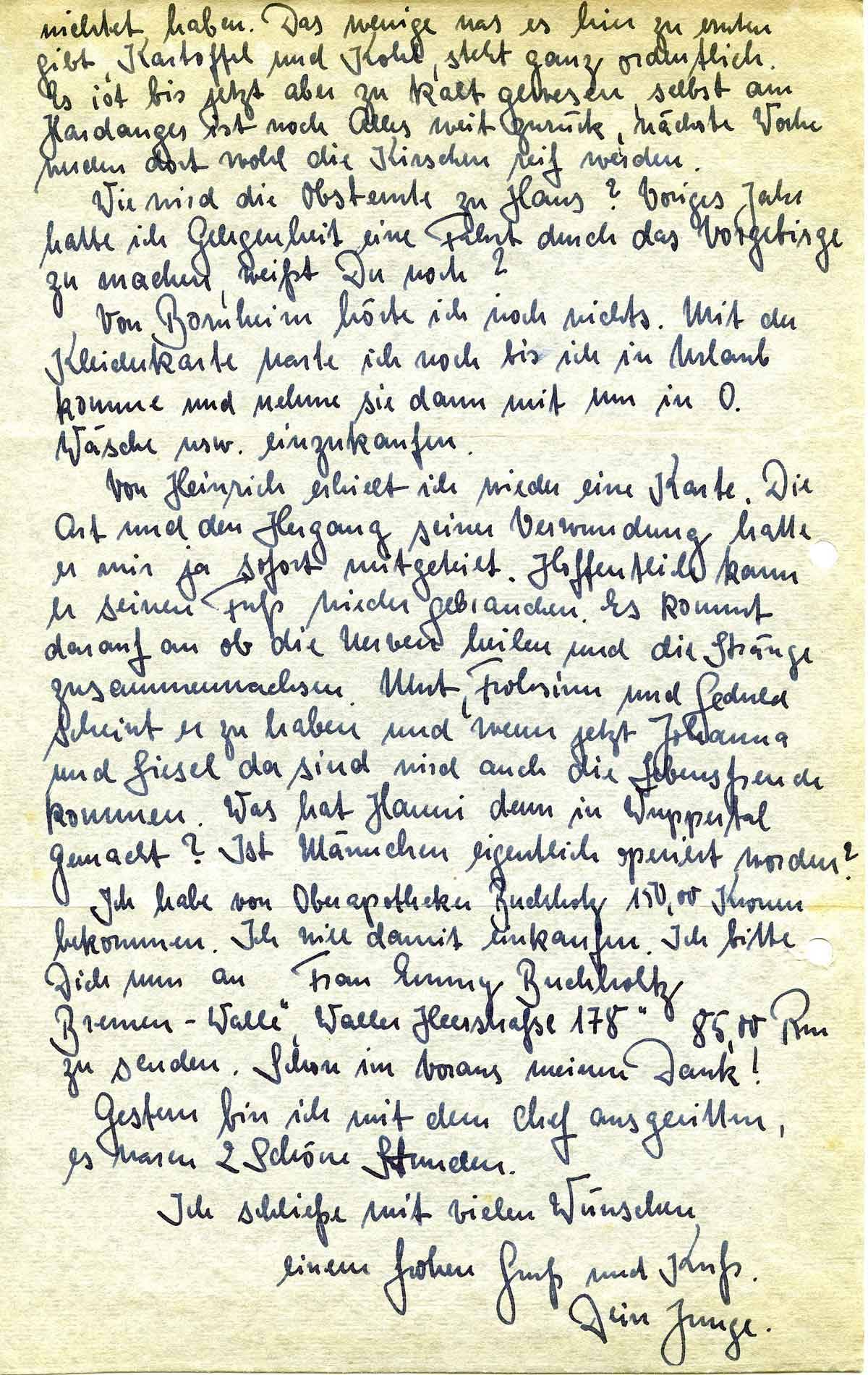 Von Bornheim hörte ich noch nichts. Mit der Kleiderkarte warte ich noch bis ich in Urlaub komme und nehme sie dann mit um in O. Wäsche usw. einzukaufen.
