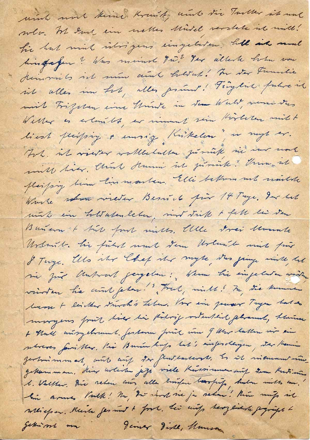 auch noch keine Braut, auch die Tochter ist noch solo. Ist doch ein nettes Mädel, verstehe ich nicht! Sie hat mich übrigens eingeladen. Soll ich mal hingehen? Was meinst Du? Der älteste Sohn von Heinrichs ist nun auch Soldat! In der Familie ist alles im Lot, alles gesund! Täglich fahre ich mit Fritzchen eine Stunde in den Wald, wenn das Wetter es erlaubt, er nimmt sein Körbchen mit + liest fleißig + emsig „Kükelen“, so sagt er. Joh. ist wieder wohlbehalten zurück, sie war noch nicht hier. Auch Hanni ist zurück! Oma ist fleißig am Einmachen. Elli bekommt nächste Woche schon wieder Besuch für 14 Tage. Der hat auch ein Soldatenleben, sind dick + fett bei den Bauern + tut fast nichts. Alle drei Monate Urlaub. Sie fährt nach dem Urlaub mit für 8 Tage. Als ihr Chef ihr sagte, das ginge nicht, hat sie zur Antwort gegeben: „Wenn Sie eingeladen würden, würden Sie auch gehen!“ Frech, nicht! Ja, die kommen besser + leichter durch’s Leben. Vor ein paar Tagen hat es morgens früh hier bei Röhrig ordentlich gebrannt, Scheune + Stall ausgebrannt. Gestern früh um 9 Uhr hatten wir ein schweres Gewitter. Bei Braunhofs hat’s eingeschlagen, der Kamin zertrümmert, auch auf der Gladbacherstr. Es ist niemand umgekommen. Hier arbeiten jetzt viele Russinnen auf dem Radium b. Walther. Die sehen aus, alle laufen barfuß, haben nichts an! Ein armes Volk! Na, Du wirst sie ja sehen! Nun muß ich schließen. Bleibe gesund + froh. Sei aufs herzlichste gegrüßt + geküsst von