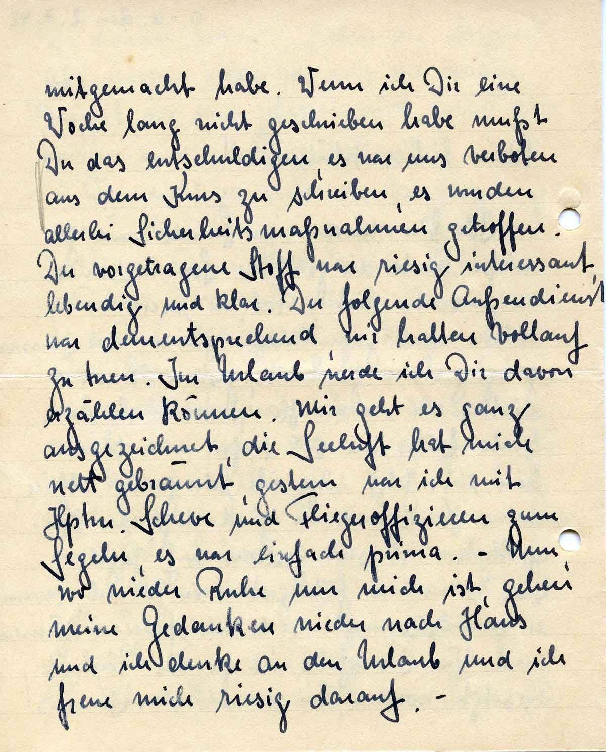 mitgemacht habe. Wenn ich Dir eine Woche lang nicht geschrieben habe mußt Du das entschuldigen, es war uns verboten aus dem Kurs zu schreiben, es wurden allerlei Sicherheitsmaßnahmen getroffen. Der vorgetragene Stoff war riesig interessant, lebendig und klar. Der folgende Außendienst war dementsprechend, wir hatten vollauf zu tuen. Im Urlaub werde ich Dir davon erzählen können. Mir geht es ganz ausgezeichnet, die Seeluft hat mich nett gebräunt, gestern war ich mit Hptm. Scheve und Fliegeroffizieren zum Segeln, es war einfach prima. – Nun, wo wieder Ruhe um mich ist, gehen meine Gedanken wieder nach Haus und ich denke an den Urlaub und ich freue mich riesig darauf. –