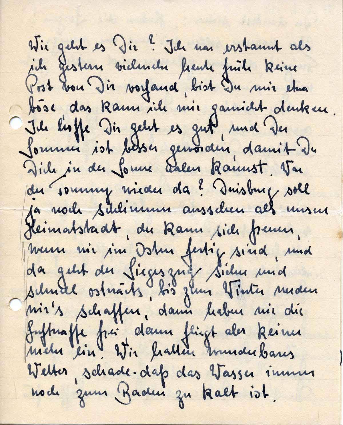 Wie geht es Dir? Ich war erstaunt als ich gestern vielmehr heute früh keine Post von Dir vorfand, bist Du mir etwa böse, das kann ich mir garnicht denken. Ich hoffe Dir geht es gut, und der Sommer ist besser geworden, damit Du Dich in der Sonne aalen kannst. War der Tommy wieder da? Duisburg soll ja noch schlimmer aussehen als unsere Heimatstadt, der kann sich freuen, wenn wir im Osten fertig sind, und da geht der Siegeszug sicher und schnell ostwärts, bis zum Winter werden wir’s schaffen, dann haben wir die Luftwaffe frei, dann fliegt aber keiner mehr ein. Wir hatten wunderbares Wetter, schade – daß das Wasser immer noch zum Baden zu kalt ist.