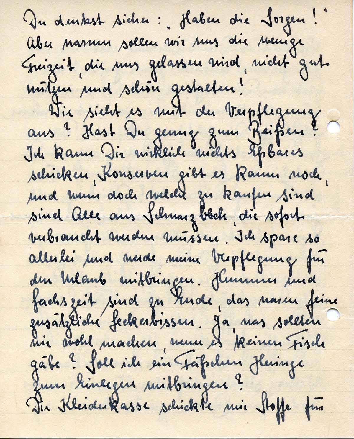 Wie sieht es mit der Verpflegung aus? Hast Du genug zum Beißen? Ich kann Die wirklich nichts Eßbares schicken, Konserven gibt es kaum noch, und wenn doch welche zu kaufen sind sind Alle aus Schwarzblech, die sofort verbraucht werden müssen. Ich spare so allerlei und werde meine Verpflegung für den Urlaub mitbringen. Hummer und Lachszeit sind zu Ende, das waren feine zusätzliche Leckerbissen. Ja, was sollten wir wohl machen, wenn es keinen Fisch gäbe? Soll ich ein Fäßchen Heringe zum Einlegen mitbringen?