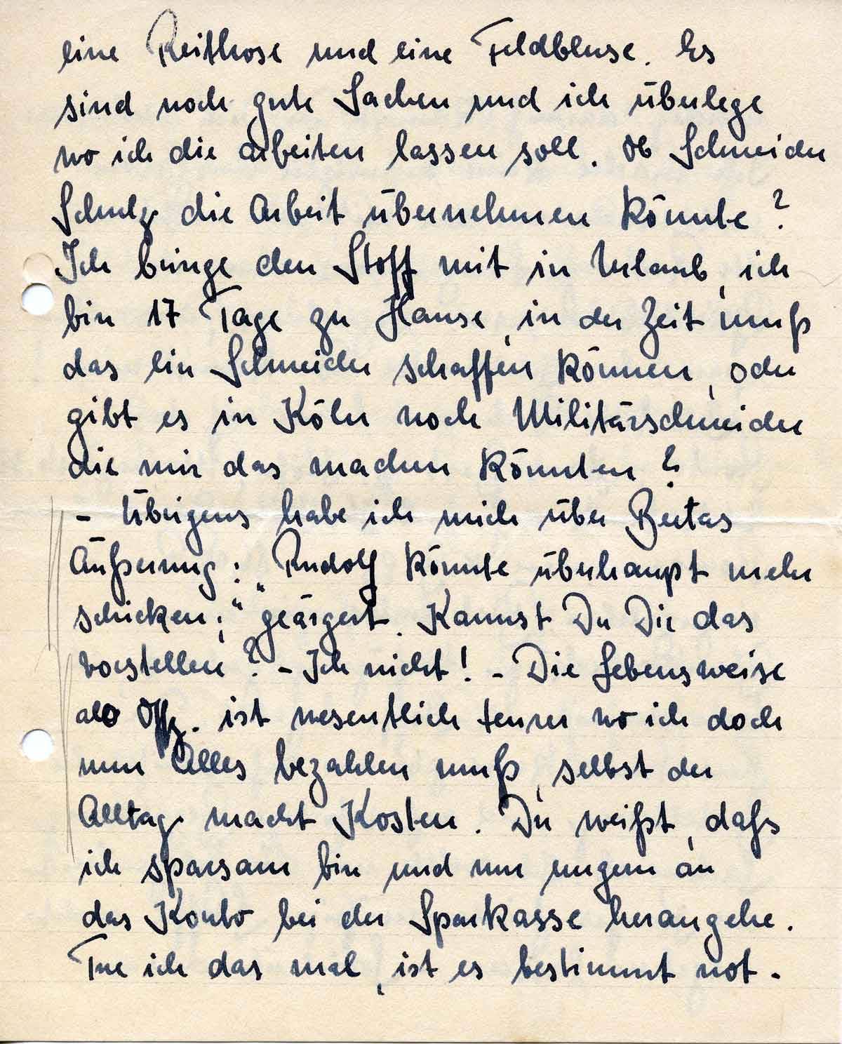 - Übrigens habe ich mich über Bertas Äußerung: „Rudolf könnte überhaupt mehr schicken“, geärgert. Kannst Du Dir das vorstellen? – Ich nicht! – Die Lebensweise als Offz. ist wesentlich teurer wo ich doch nun Alles bezahlen muß, selbst der Alltag macht Kosten. Du weißt, daß ich sparsam bin und nur ungern an das Konto bei der Sparkasse herangehe. Tue ich das mal, ist es bestimmt not-