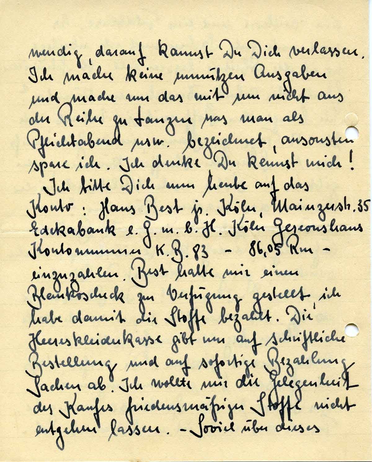 Ich bitte Dich nun heute auf das Konto: Hans Best jr. Köln, Mainzerstr. 35 Edekabank e.G.m.b.H. Köln Gereonshaus Kontonummer K.B. 83 – 86,05 Rm – einzuzahlen. Best hatte mir einen Blankoscheck zur Verfügung gestellt, ich habe damit die Stoffe bezahlt. Die Heereskleiderkasse gibt nur auf schriftliche Bestellung und auf sofortige Bezahlung Sachen ab. Ich wollte mir die Gelegenheit des Kaufes friedensmäßiger Stoffe nicht entgehen lassen. – Soviel über dieses