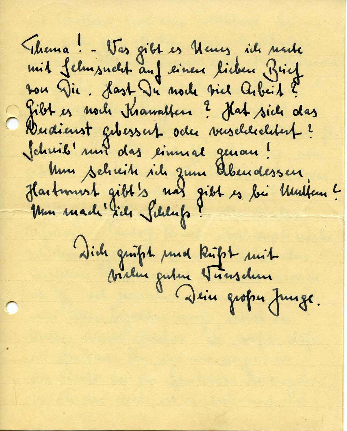 Thema! – Was gibt es Neues, ich warte mit Sehnsucht auf einen lieben Brief von Dir. Hast Du noch viel Arbeit? Gibt es noch Krawatten? Hat sich das Verdienst gebessert oder verschlechtert? Schreib‘ mir das einmal genau!
