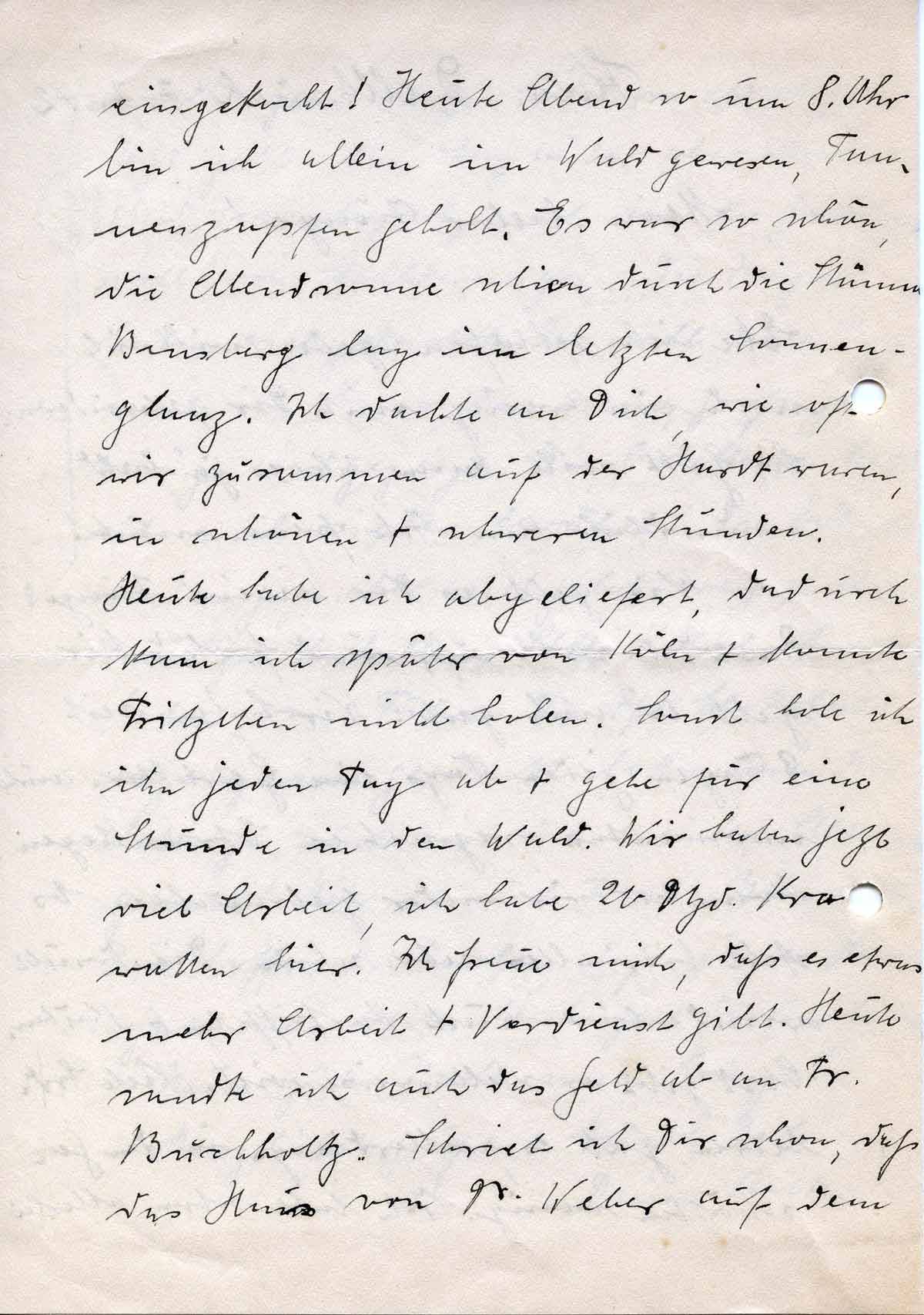 Heute habe ich abgeliefert, dadurch kam ich später von Köln + konnte Fritzchen nicht holen. Sonst hole ich ihn jeden Tag ab + gehe für eine Stunde in den Wald. Wir haben jetzt viel Arbeit, ich habe 20 Dtzd. Krawatten hier. Ich freue mich, daß es etwas mehr Arbeit + Verdienst gibt. Heute sandte ich auch das Geld ab an Fr. Buchholtz. Schrieb ich Dir schon, daß das Haus von Dr. Weber auf dem