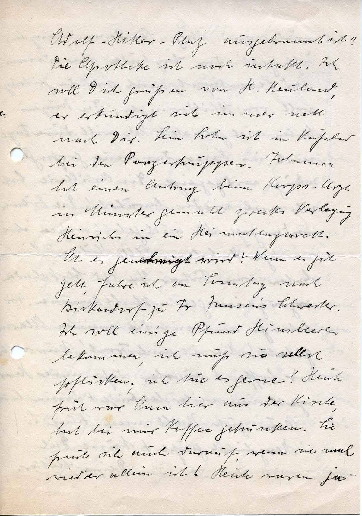 Adolf-Hitler-Platz ausgebrannt ist? Die Apotheke ist noch intakt. Ich soll Dich grüßen von H. Reuland, er erkundigt sich immer nett nach Dir. Sein Sohn ist in Rußland bei den Panzertruppen. Johanna hat einen Antrag beim Korps-Arzt in Münster gemacht zwecks Verlegung Heinrichs in ein Heimatlazarett. Ob es genehmigt wird? Wenn es gut geht, fahre ich am Sonntag nach Bickendorf zu Fr. Jansen’s Schwester. Ich soll einige Pfund Himbeeren bekommen, ich muß sie selbst pflücken; ich tue es gerne! Heute früh war Oma hier aus der Kirche, hat bei mir Kaffee getrunken. Sie freut sich auch darauf, wenn sie mal wieder allein ist! Heute waren ja