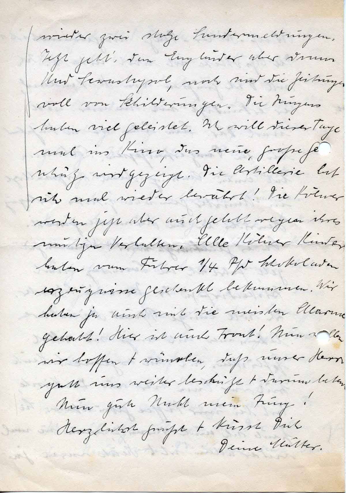 wieder zwei stolze Sondermeldungen. Jetzt geht‘s dem Engländer aber drum. Und Sewastopol, noch sind die Zeitungen voll von Schilderungen. Die Jungens haben viel geleistet. Ich will dieser Tage mal ins Kino, das neue, große Geschütz wird gezeigt. Die Artillerie hat sich mal wieder bewährt! Die Kölner werden jetzt aber auch gelobt wegen ihres mutigen Verhaltens. Alle Kölner Kinder haben vom Führer ¼ Pfd Schokoladenerzeugnisse geschenkt bekommen. Wir haben ja auch mit die meisten Alarme gehabt! Hier ist auch Front! Nun wollen wir hoffen + wünschen, daß unser Herrgott uns weiter beschützt + darum beten.