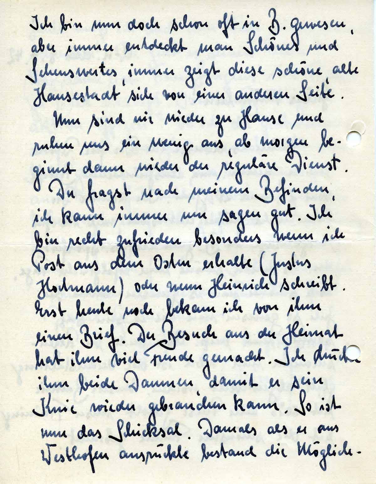 Nun sind wir wieder zu Hause und ruhen uns ein wenig aus, ab morgen beginnt dann wieder der reguläre Dienst. Du fragst nach meinem Befinden, ich kann immer nur sagen gut. Ich bin recht zufrieden besonders wenn ich Post aus dem Osten erhalte (Justus Hartmann) oder wenn Heinrich schreibt. Erst heute noch bekam ich von ihm einen Brief. Der Besuch aus der Heimat hat ihm viel Freude gemacht. Ich drücke ihm beide Daumen, damit er sein Knie wieder gebrauchen kann. So ist nun das Schicksal. Damals als er aus Westhofen ausrückte bestand die Möglich-