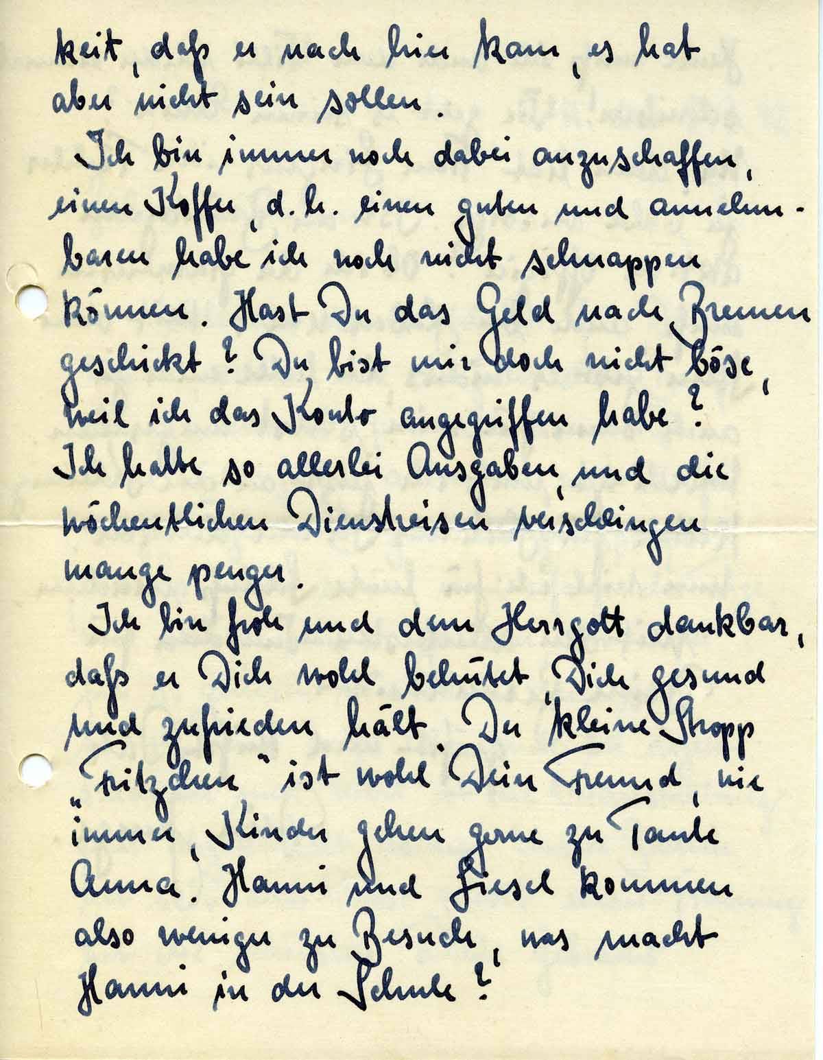 Ich bin immer noch dabei anzuschaffen, einen Koffer, d. h. einen guten und annehmbaren habe ich noch nicht schnappen können. Hast Du das Geld nach Bremen geschickt? Du bist mir doch nicht böse, weil ich das Konto angegriffen habe? Ich hatte so allerlei Ausgaben, und die wöchentlichen Dienstreisen verschlingen mange penger.