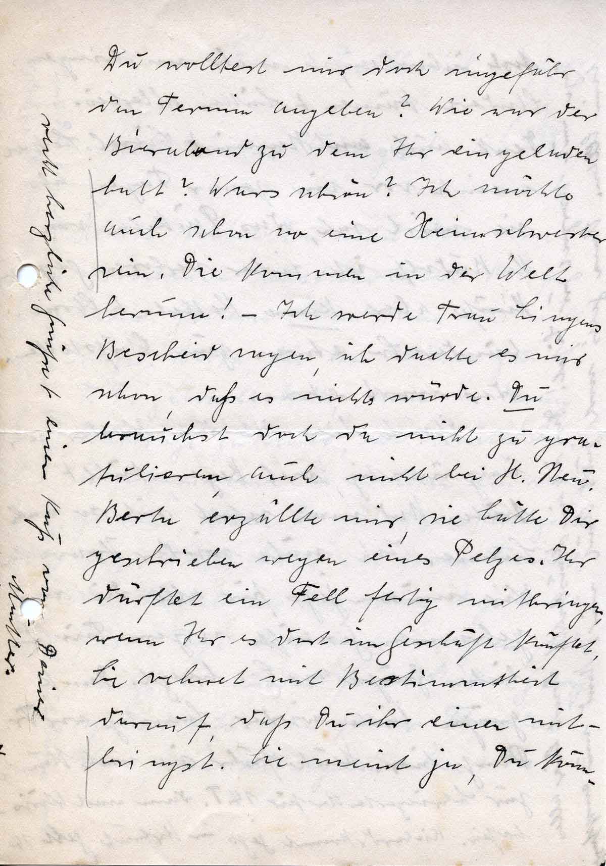 Du wolltest mir doch ungefähr den Termin angeben? Wie war der Bierabend zu dem Ihr eingeladen habt? Wars schön? Ich möchte auch schon so eine Heimschwester sein. Die kommen in der Welt herum! – Ich werde Frau Lingens Bescheid sagen, ich dachte es mir schon, daß es nichts würde. Du brauchst doch da nicht zu gratulieren, auch nicht bei H. Neu. Berta erzählte mir, sie hätte Dir geschrieben wegen eines Pelzes. Ihr dürftet ein Fell fertig mitbringen, wenn Ihr es dort im Geschäft kauftet. Sie rechnet mit Bestimmtheit darauf, daß Du ihr einen mitbringst. Sie meint ja, Du könn-