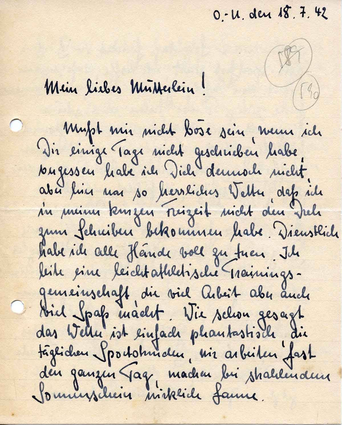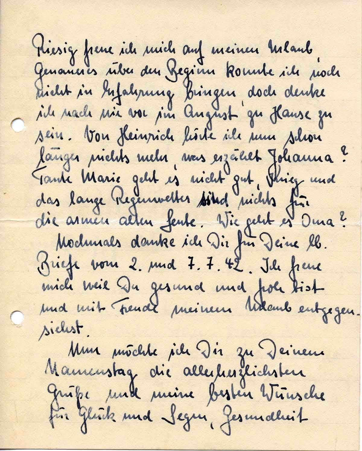 Nochmals danke ich Dir für Deine lb. Briefe vom 2. und 7.7.42. Ich freue mich weil Du gesund und froh bist und mit Freude meinem Urlaub entgegensiehst.